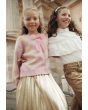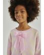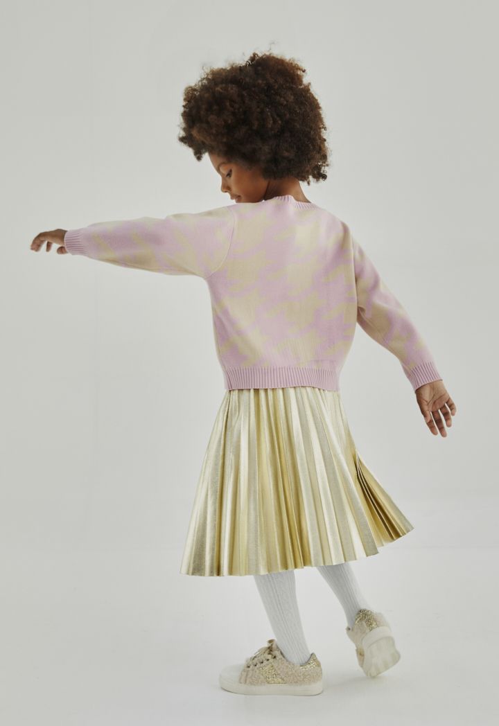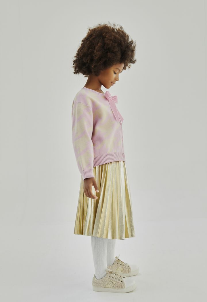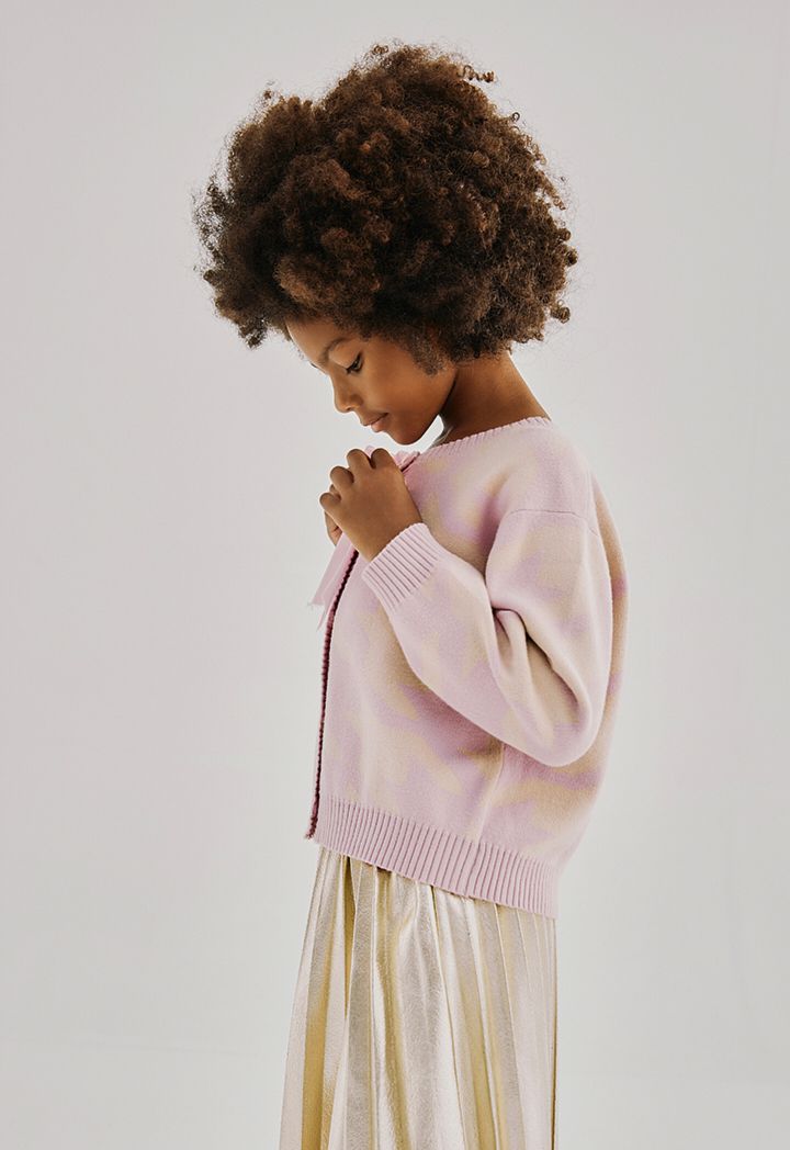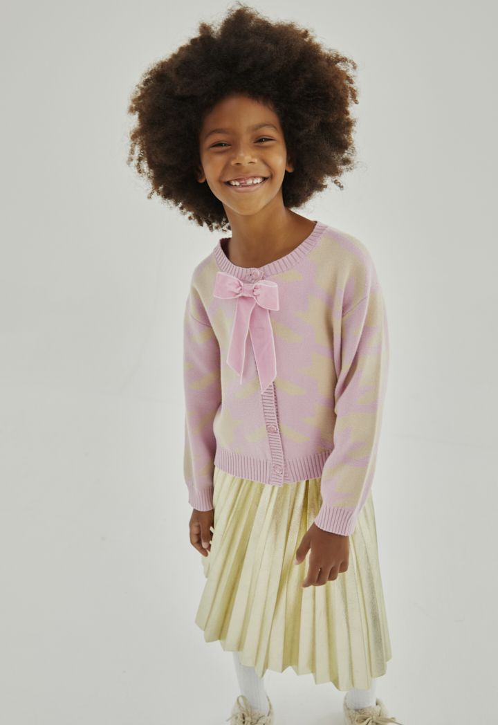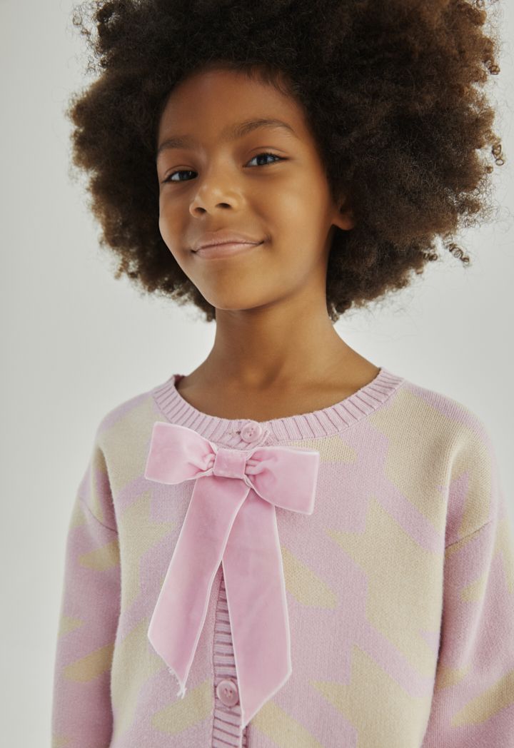 A houndstooth knitted cardigan that features a cute velvet bow neck.