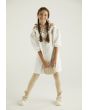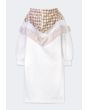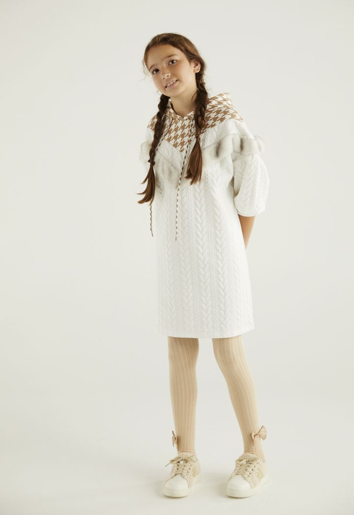 A textured hoodie dress that is accentuated with its houndstooth patterned details.