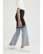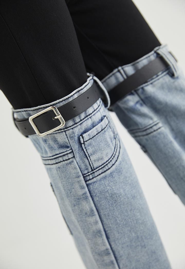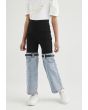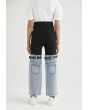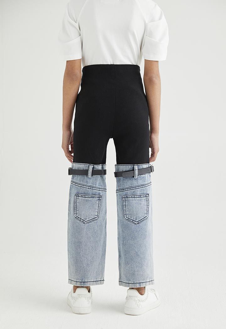 A modern pair of trousers that features a knitted elastic design with denim hems.