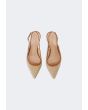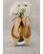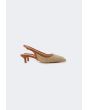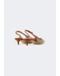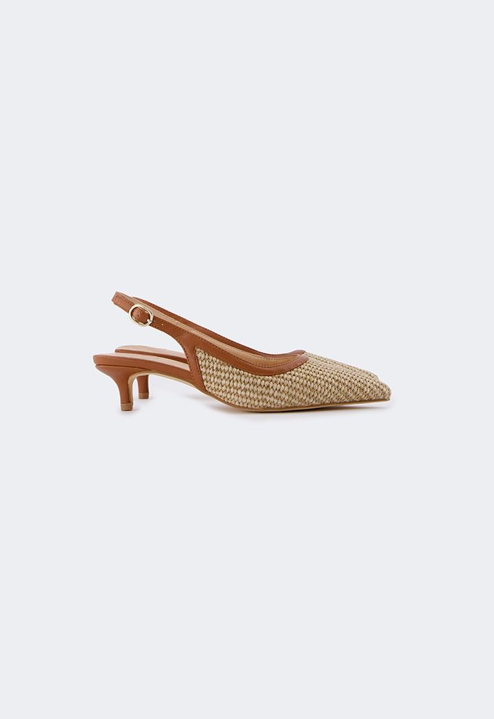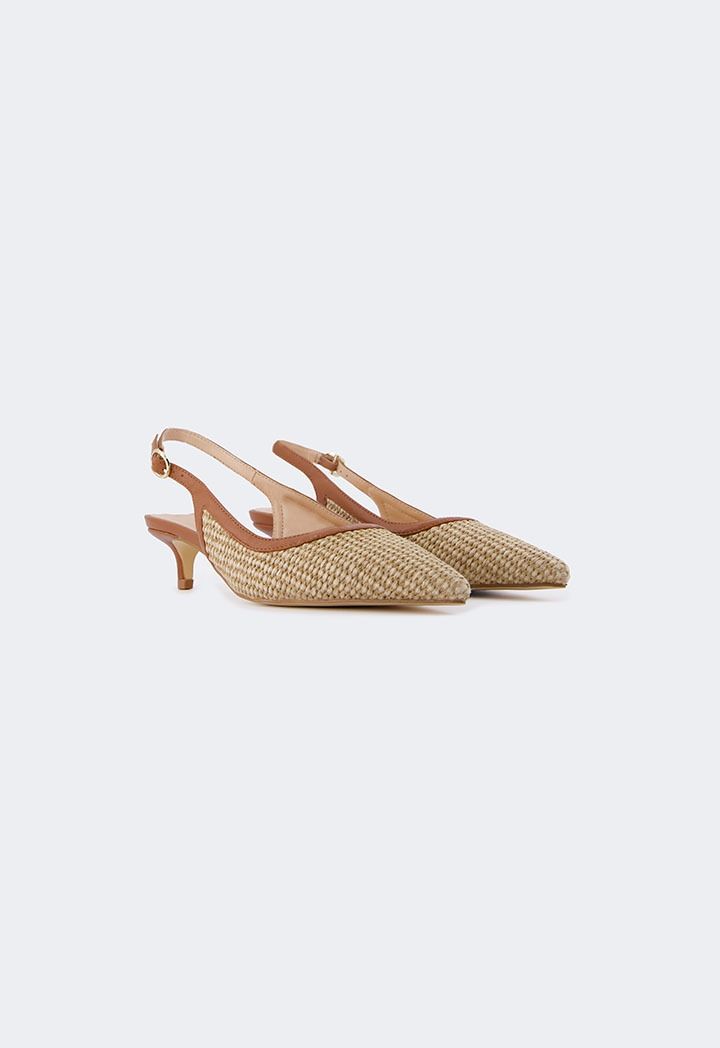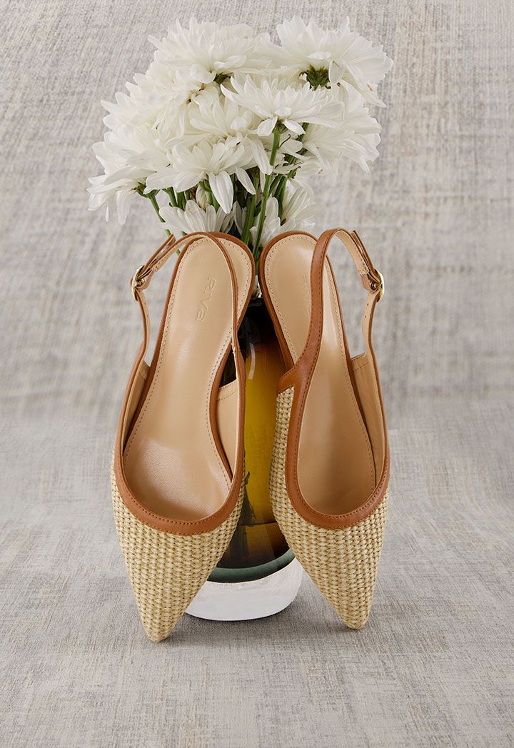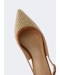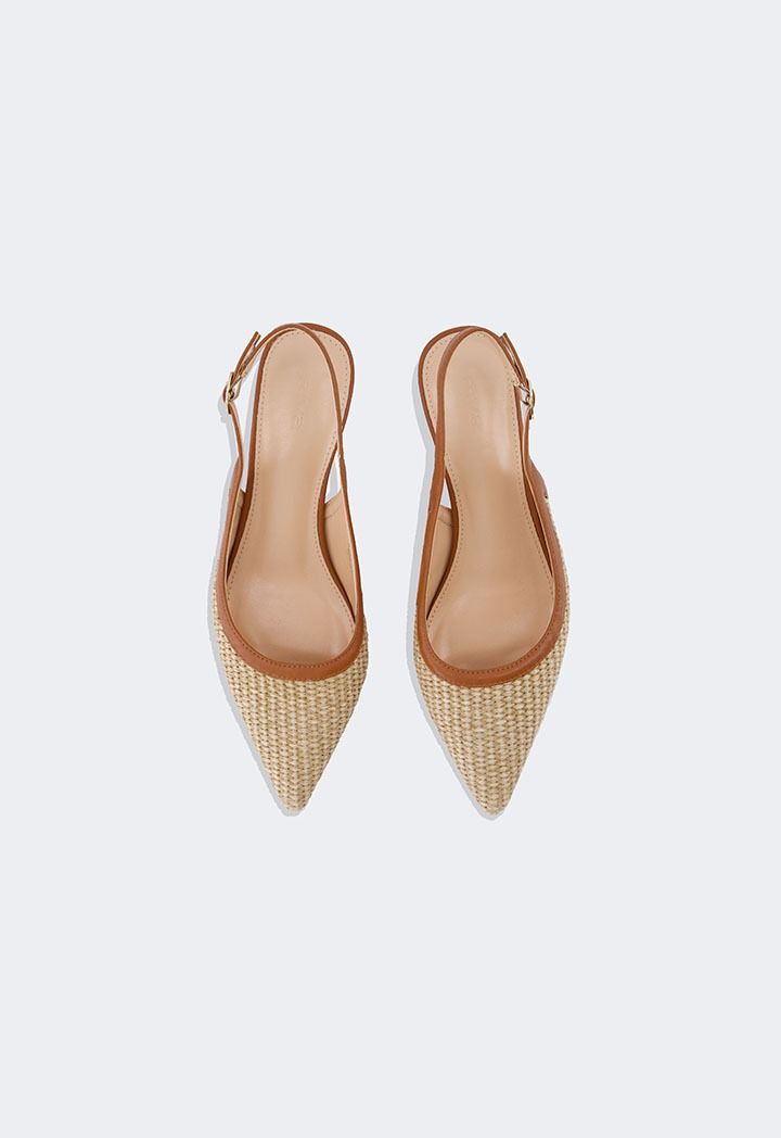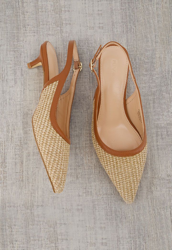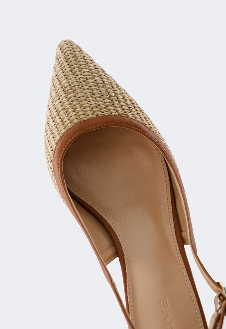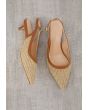 A unique approach to heels that features a classic faux straw and PU Leather design.