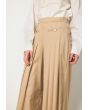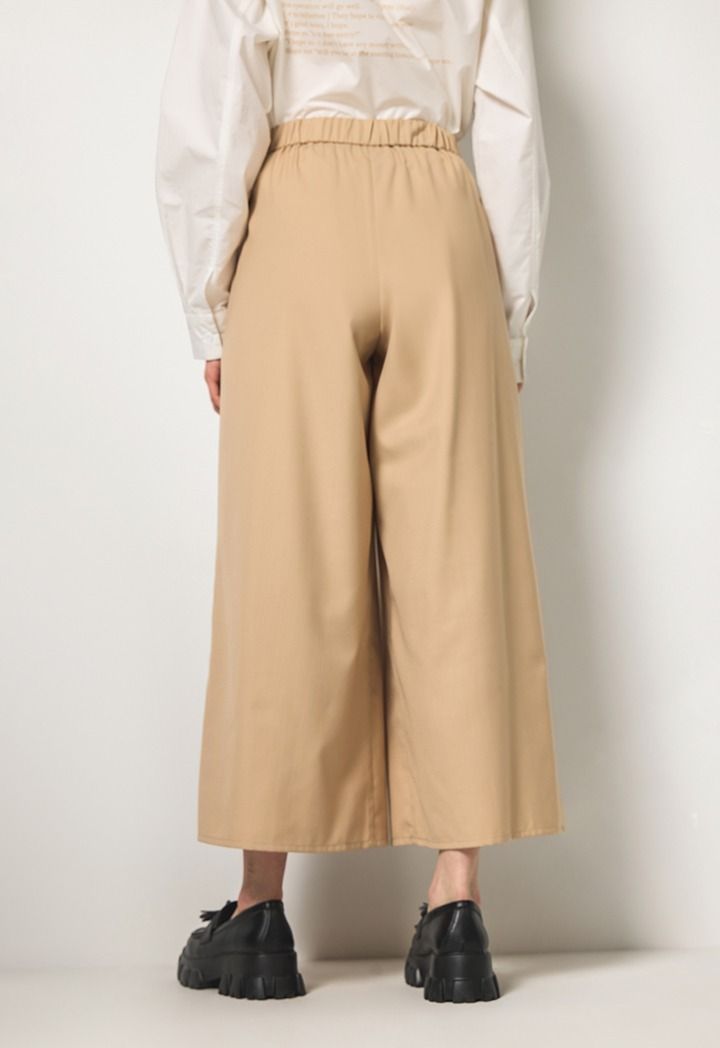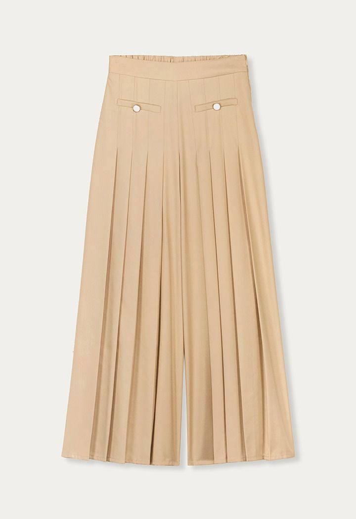 A solid pleated palazzo pair of trousers that features a gathered waist and metallic touches.