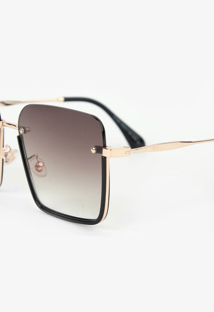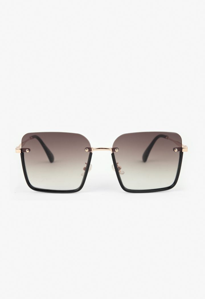 A dark pair of sunglasses that features a rimmed gradient design.