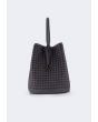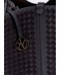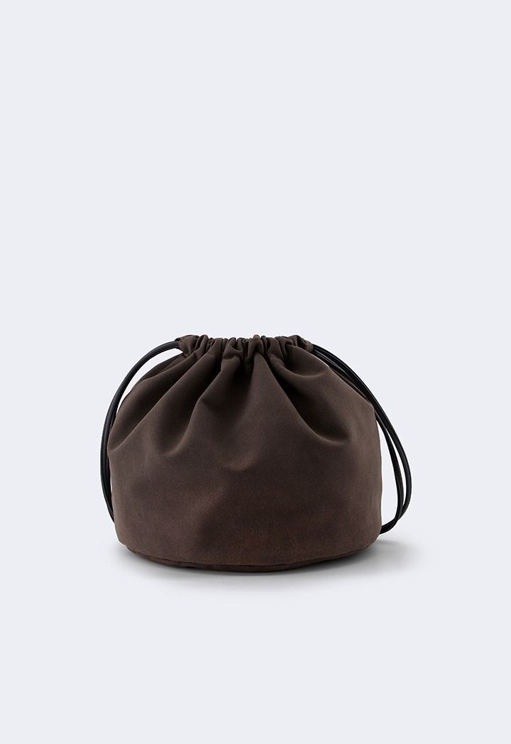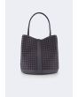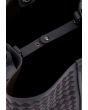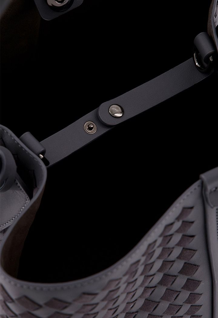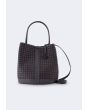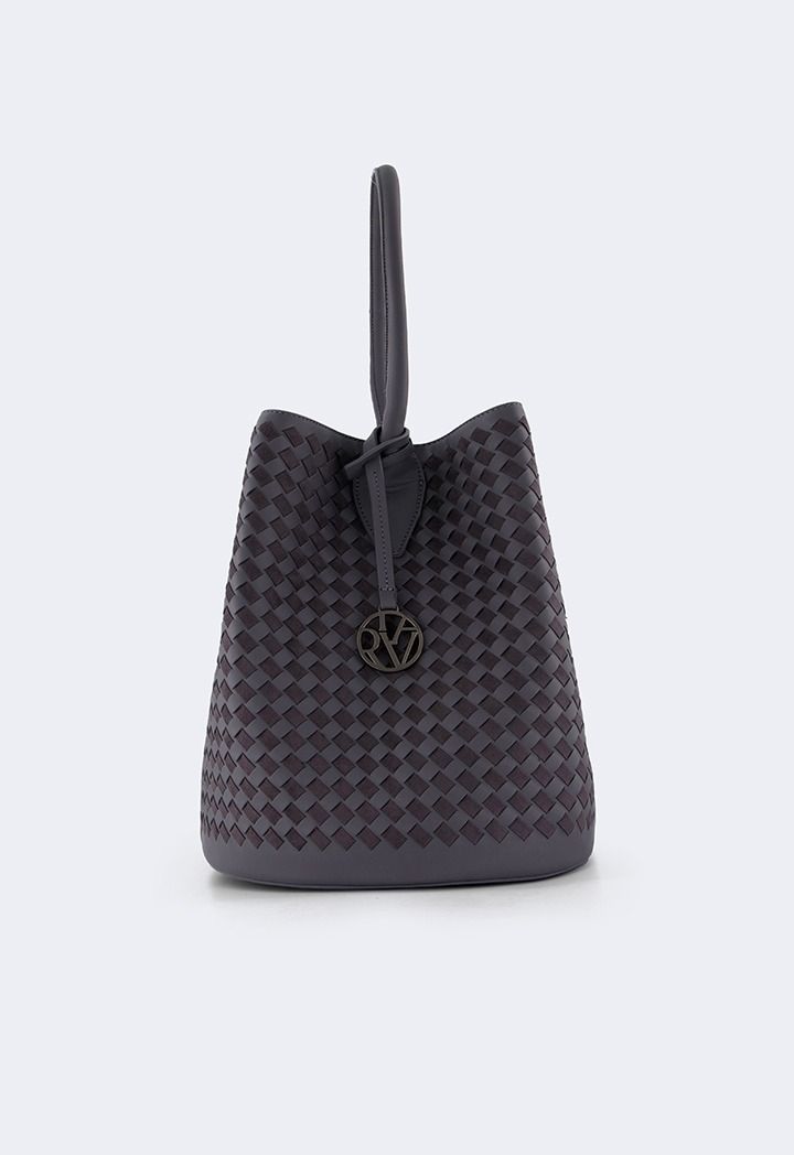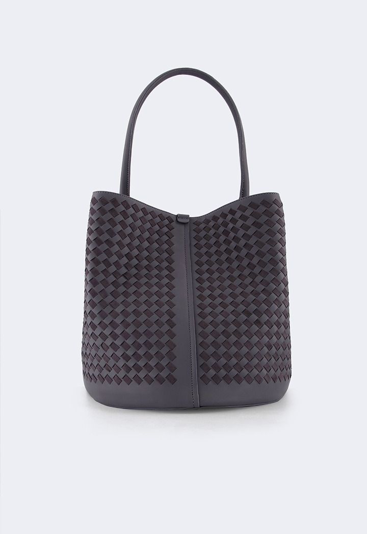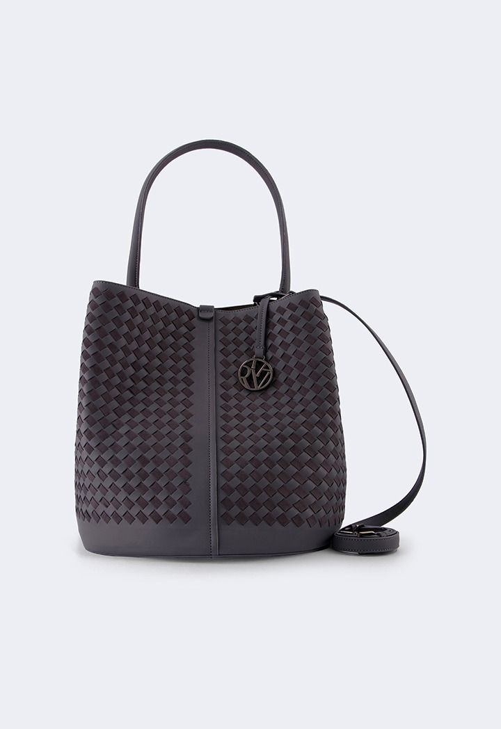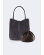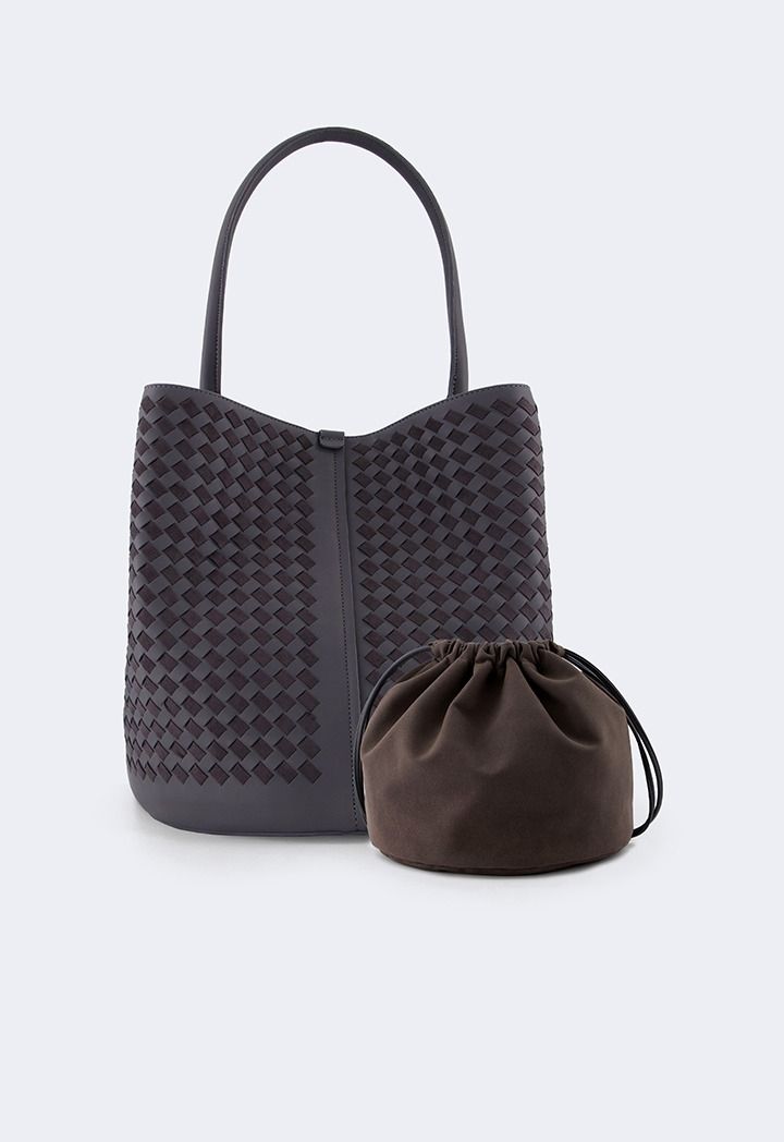 A bucket bag with an intricate design, a top handle and a detachable inner pouch.