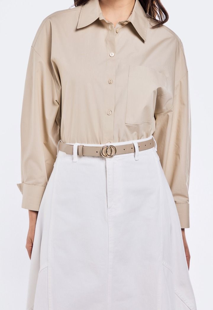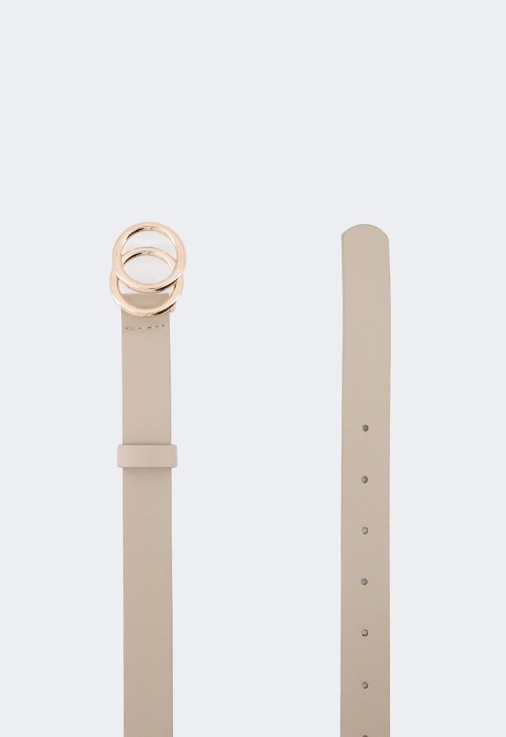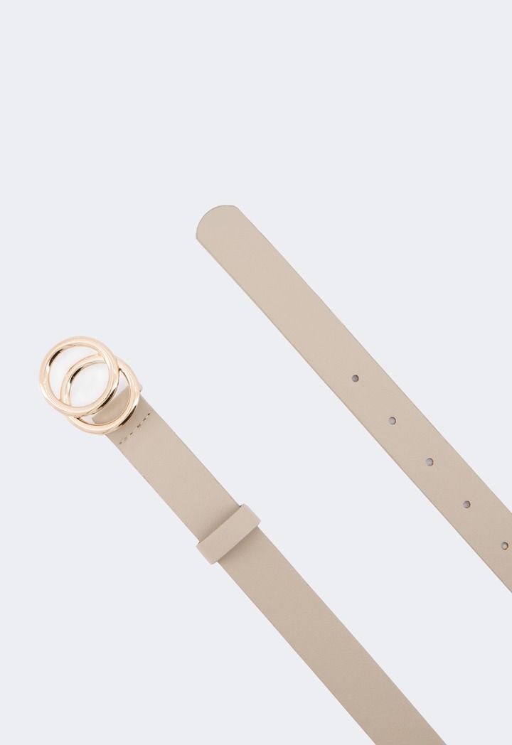 An essential belt that features a PU leather waist and an intricate circular metal clasp.