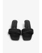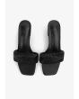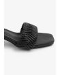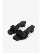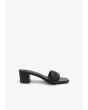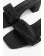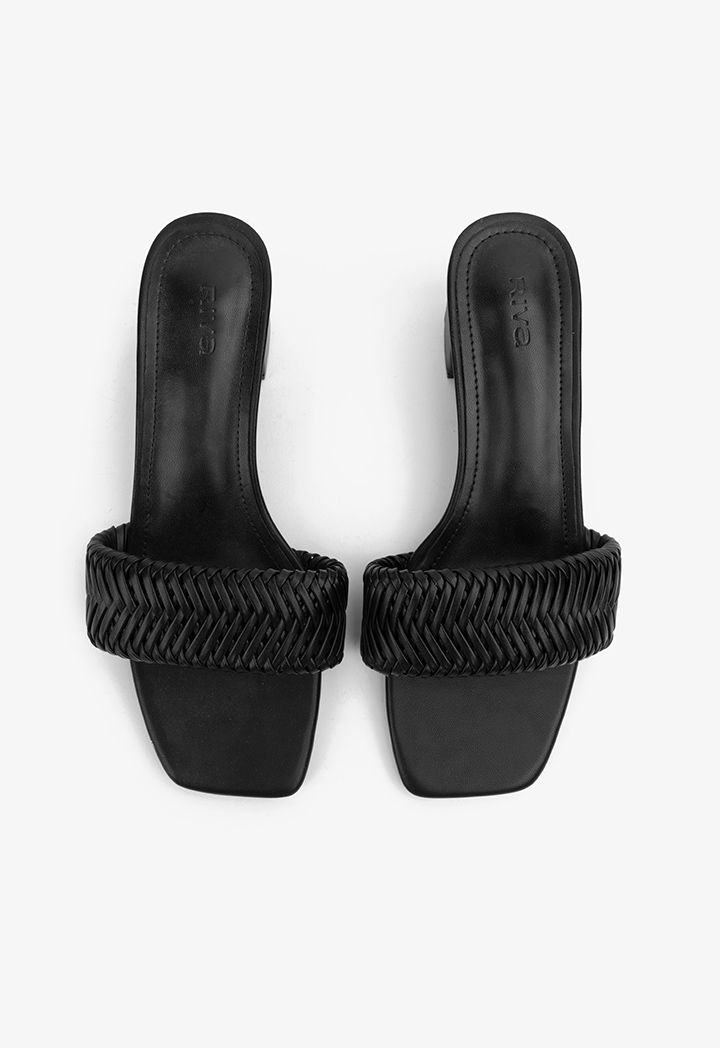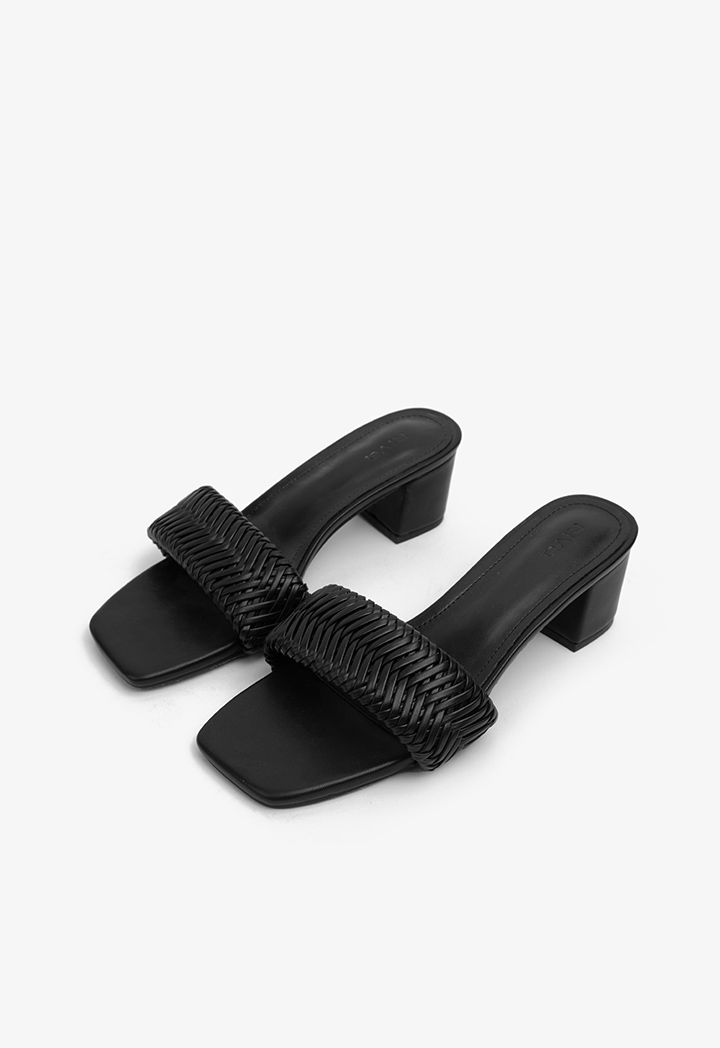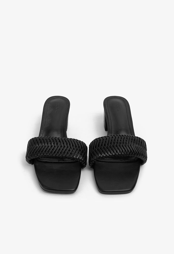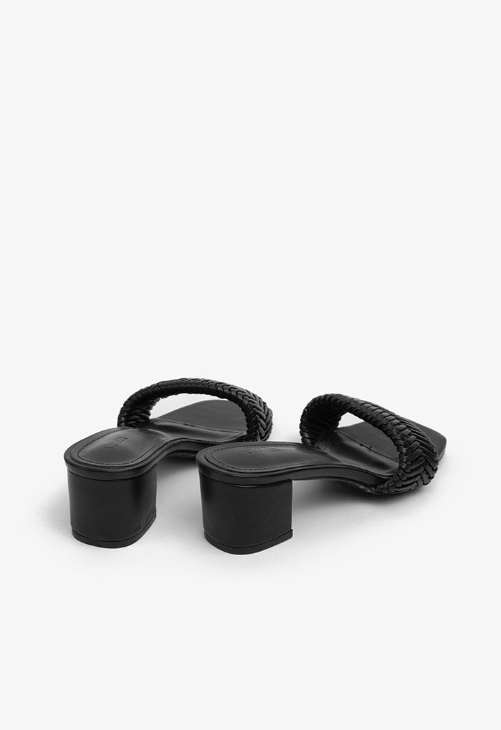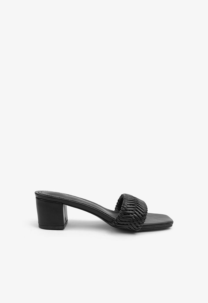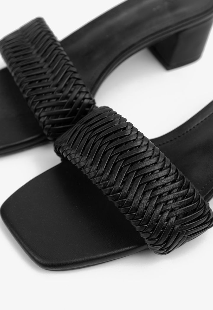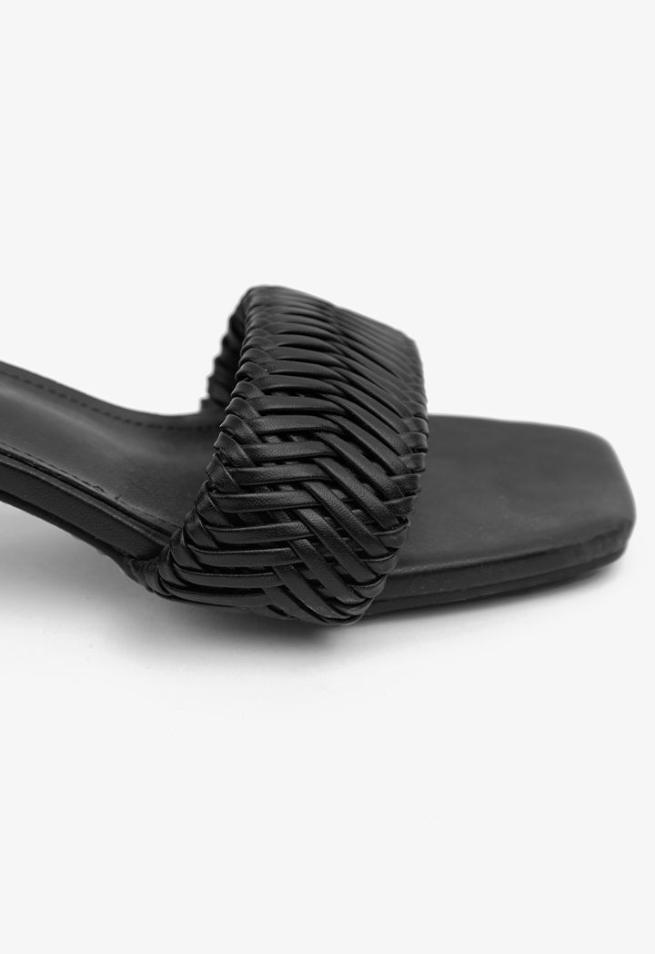 A solid heeled pair of sandals that features a unique intricate PU leather design.