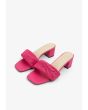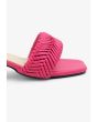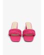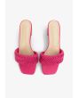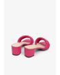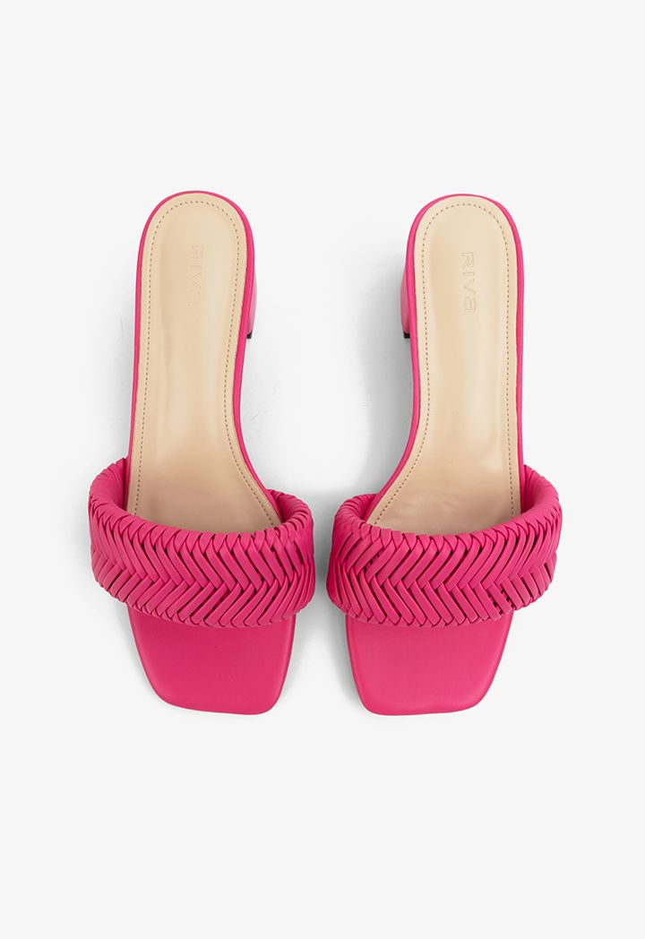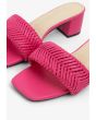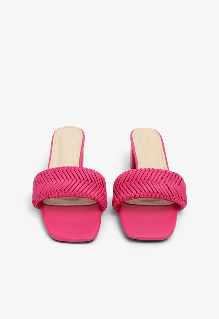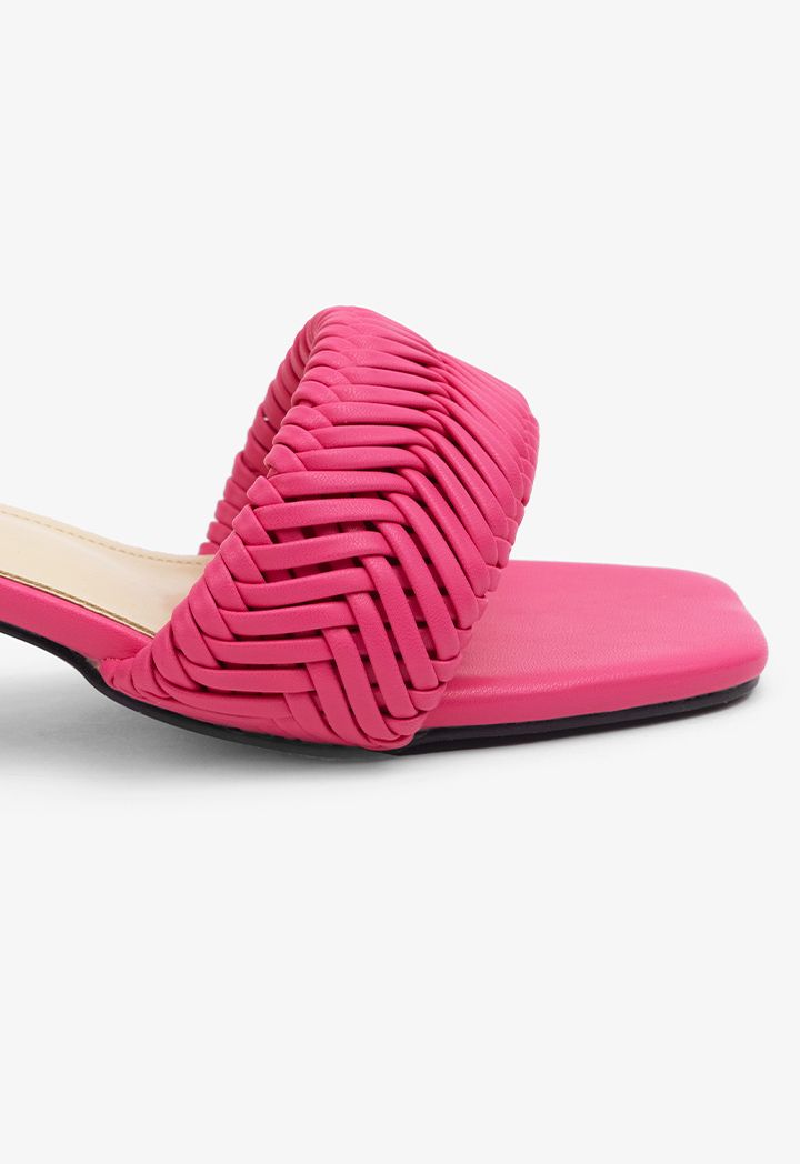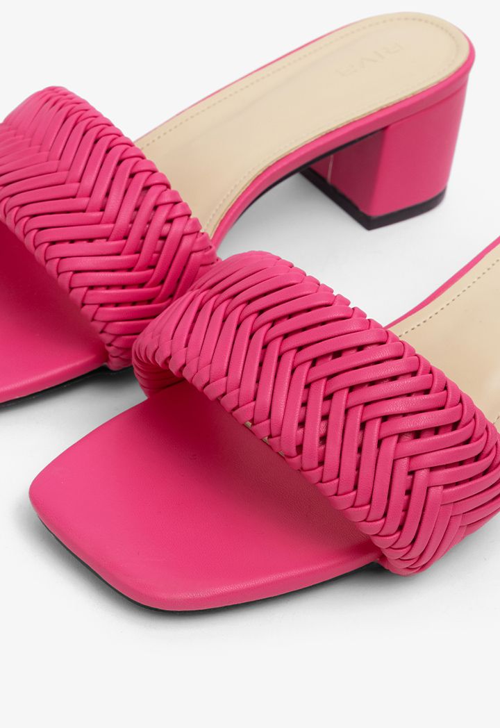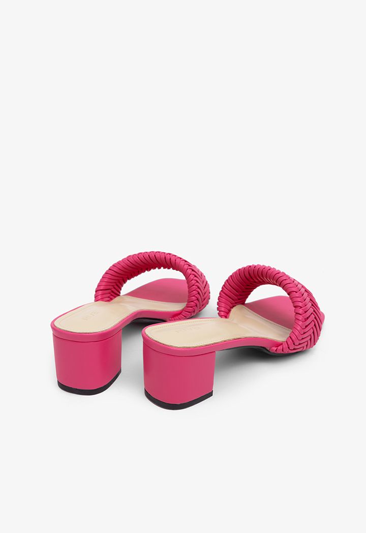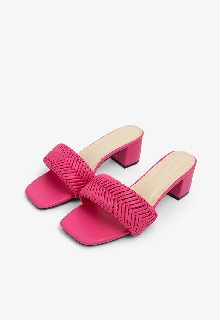 A solid heeled pair of sandals that features a unique intricate PU leather design.