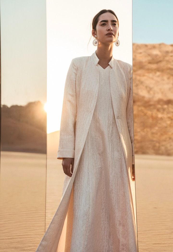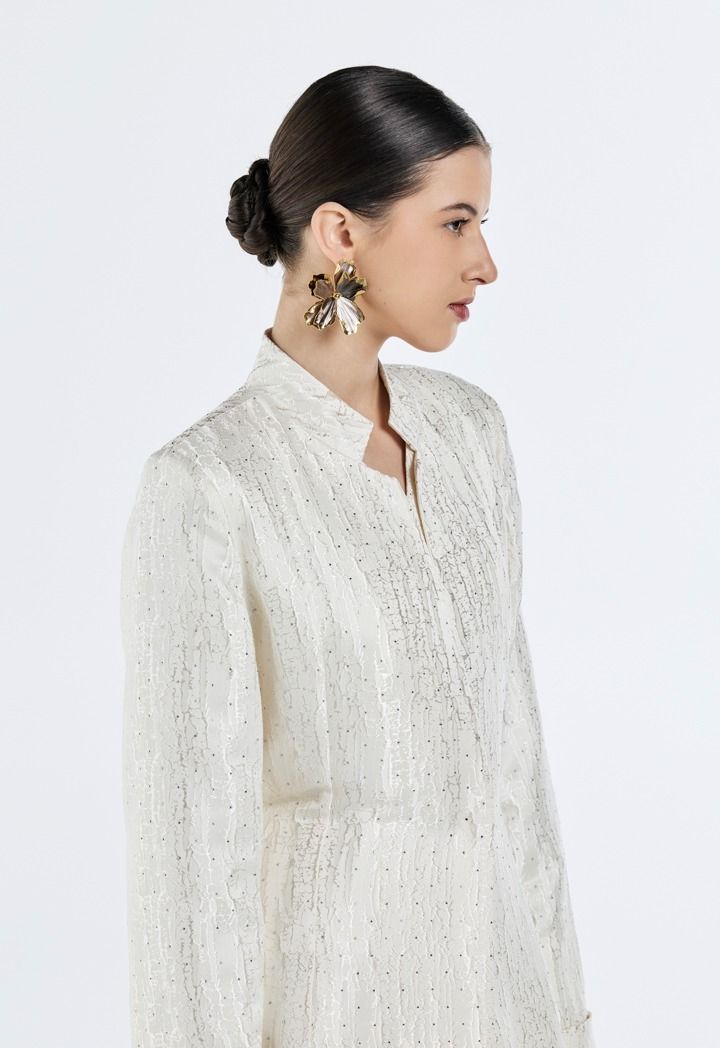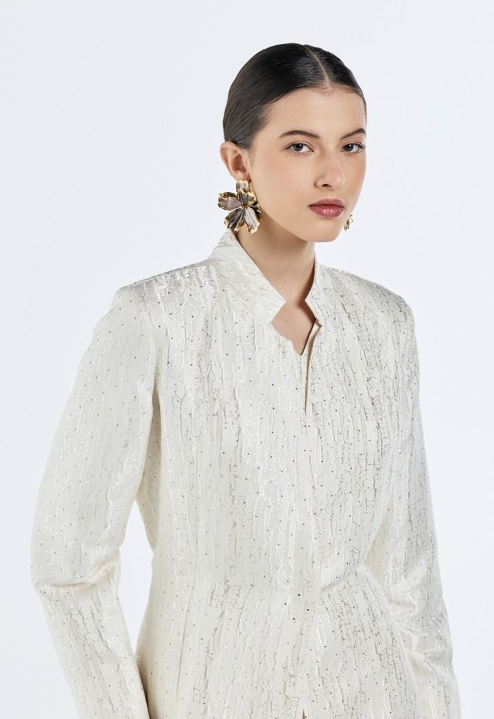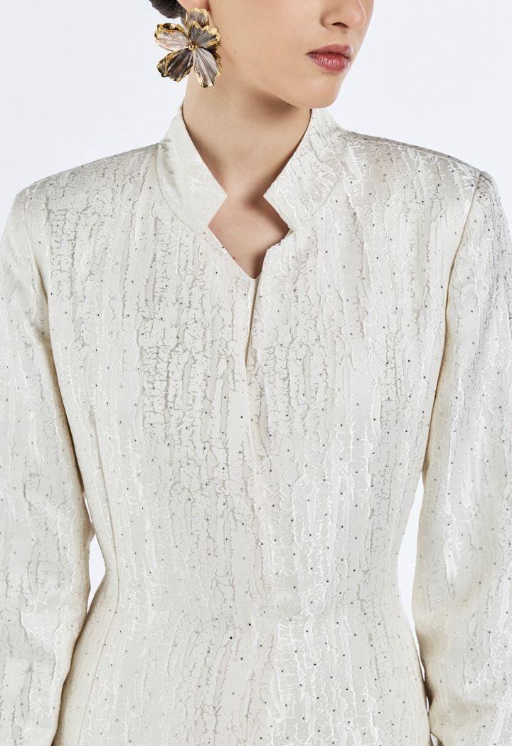 Design: Solid, Crystal Embellished, Attached Tie Belt, Attached Lining, Side & Back Slits, Jacquard
