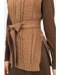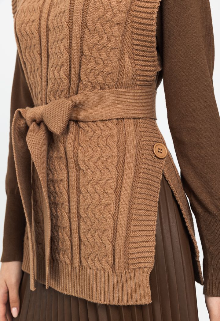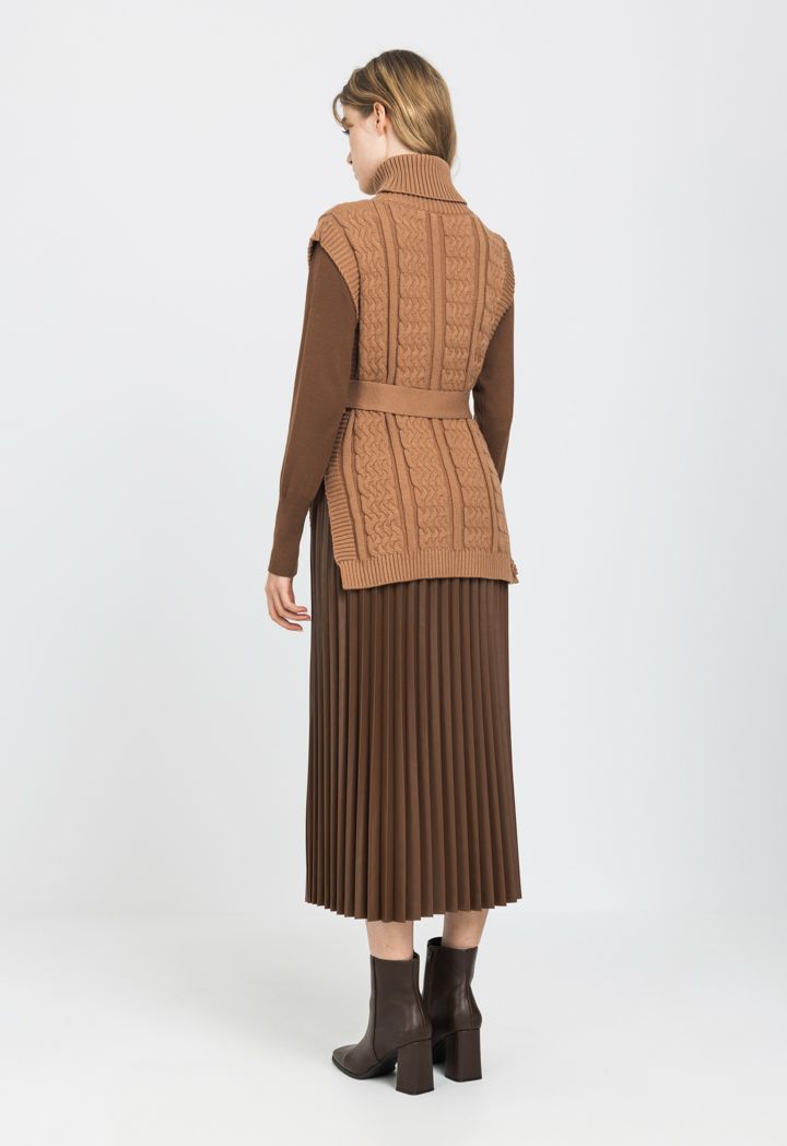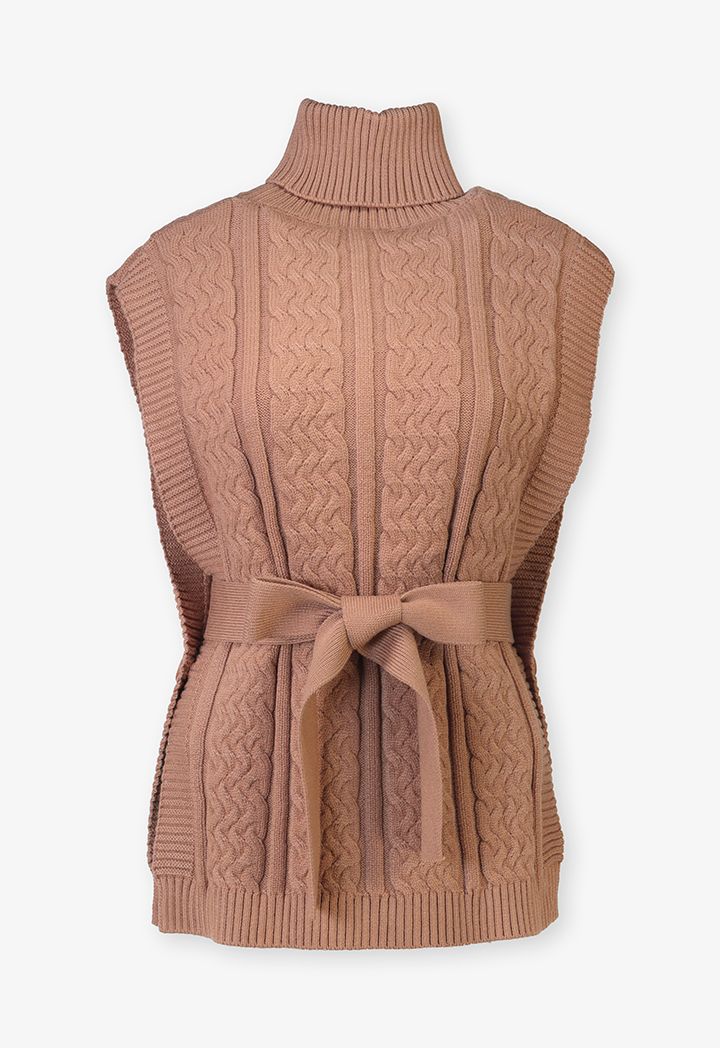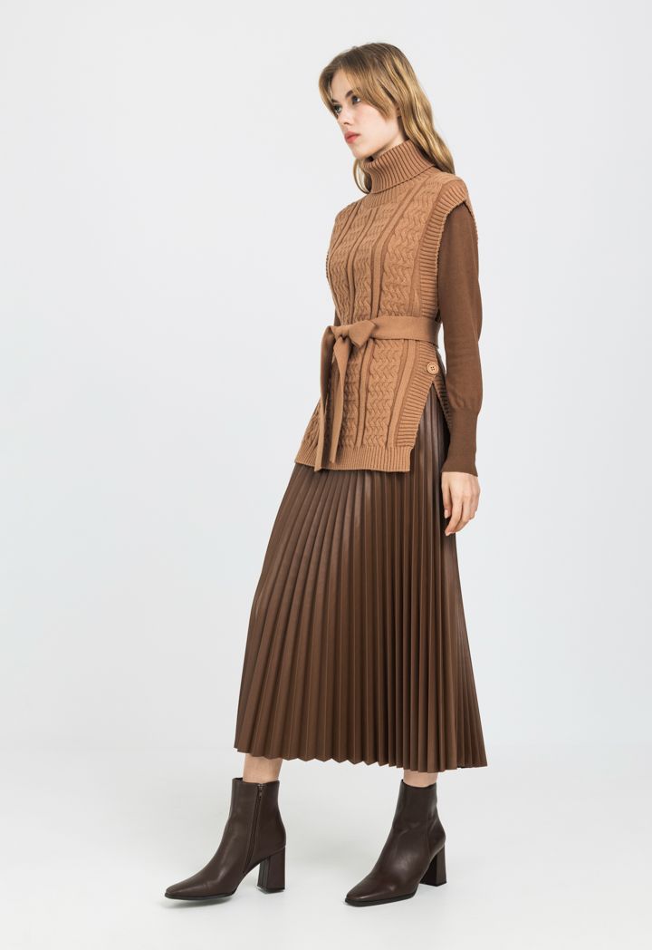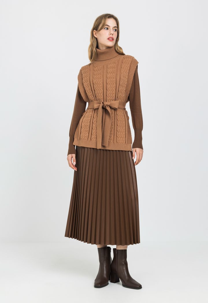 A stylish piece that features a knitted design, a turtleneck and a belt to accentuate your waist.