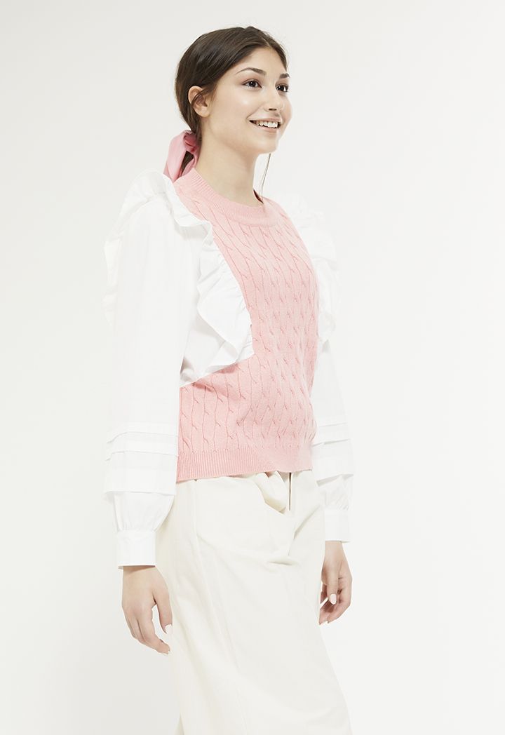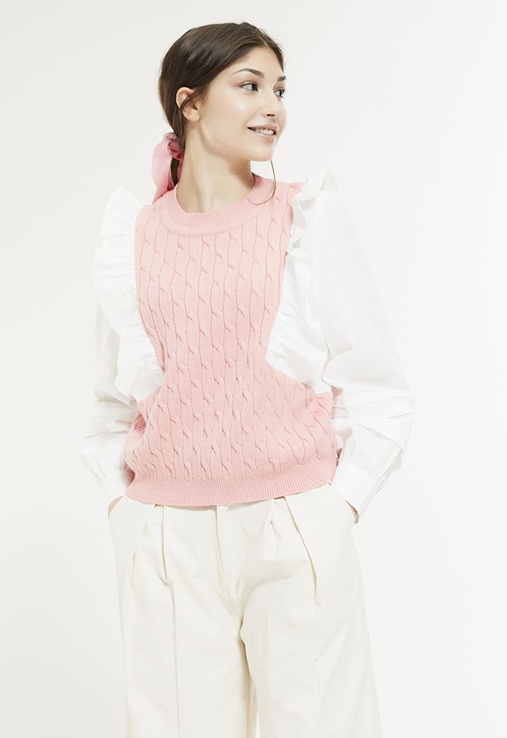 A modern blouse that features a knitted and ruffled bodice and layered sleeves.