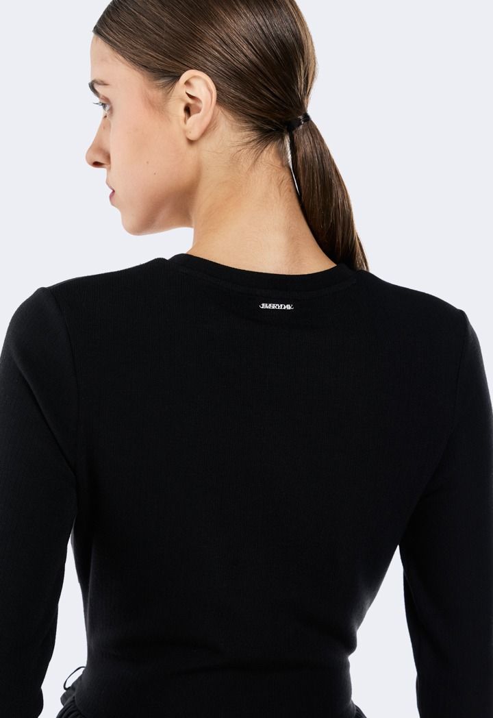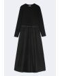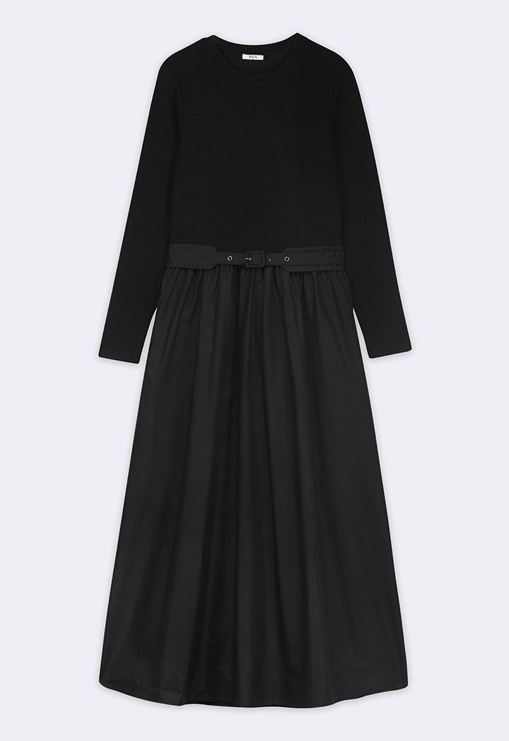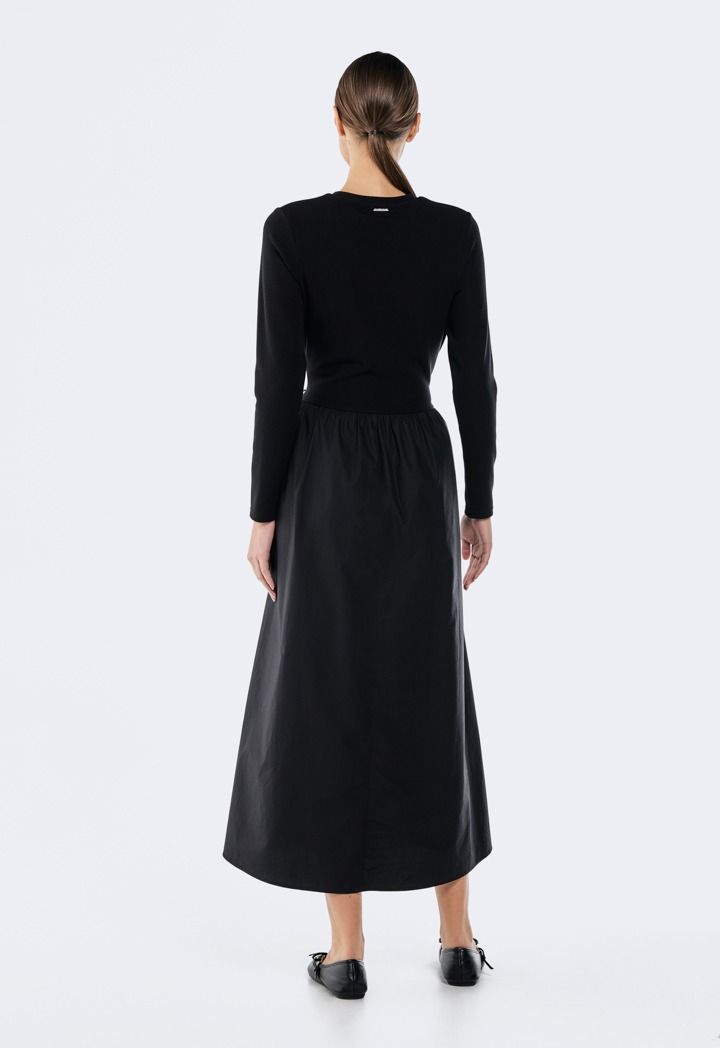This dress combines a cozy knitted top with a flowing woven skirt for effortless style and comfort. A chic mix of textures, perfect for day-to-night looks.