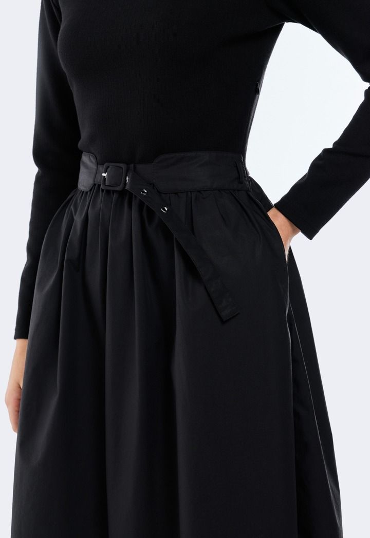 Design: Solid, Belted, Knitted Bodice, Woven Skirt, Side Pockets