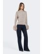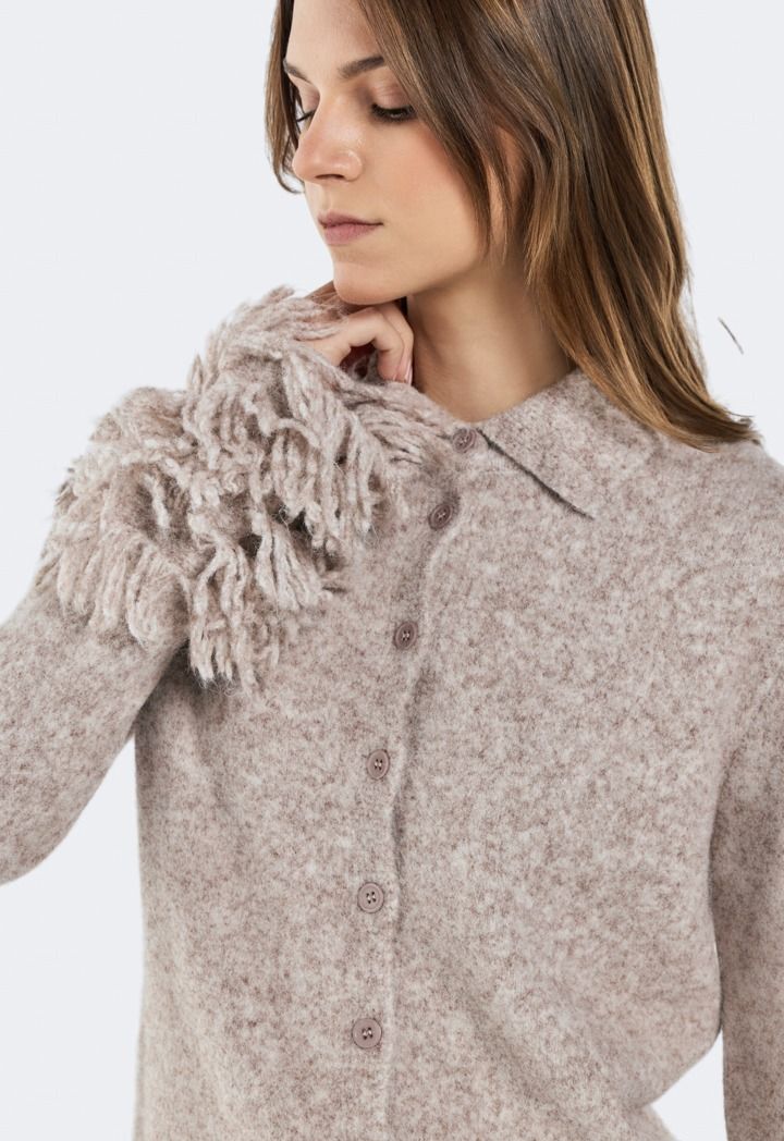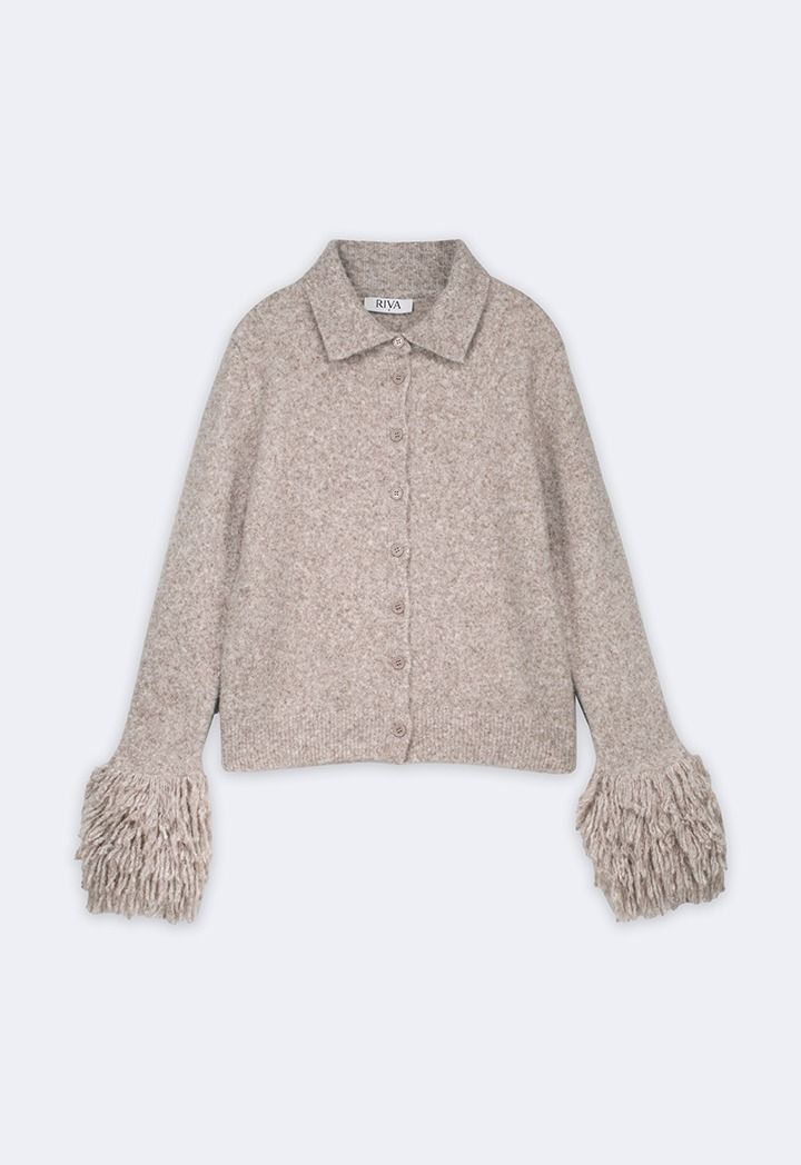 A cozy knitted cardigan elevated with statement fringed sleeves for a fashion-forward look.