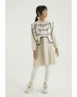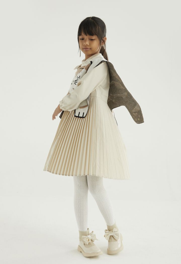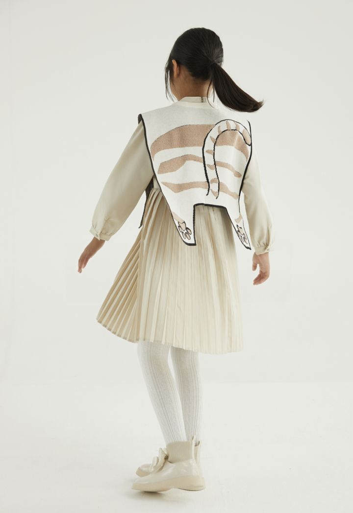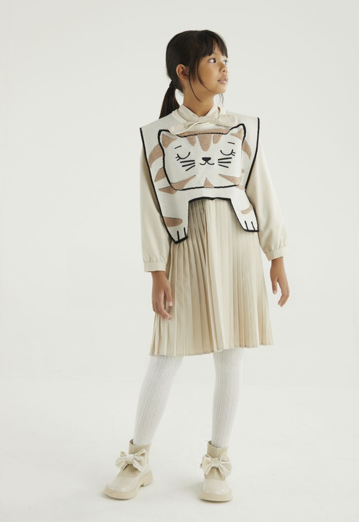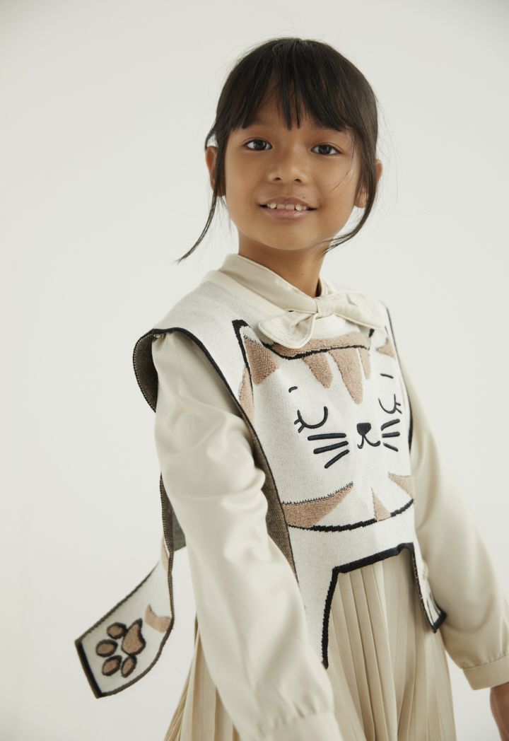 A two toned knitted cape that features a cute cat design that is easy to pair.