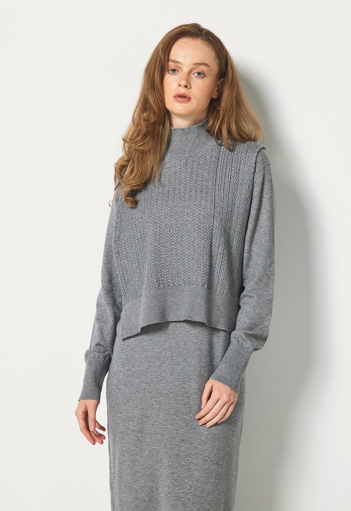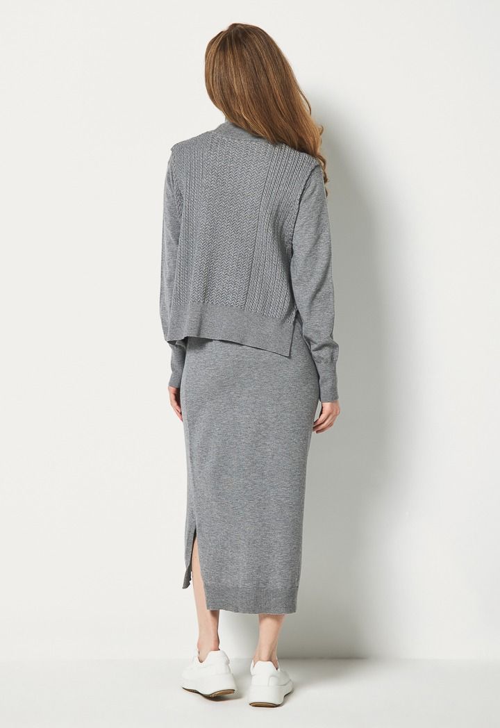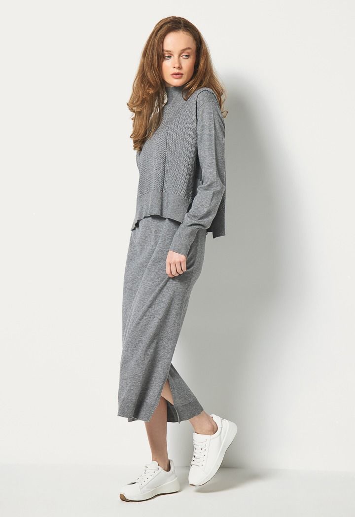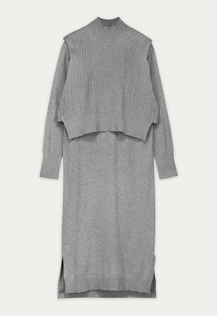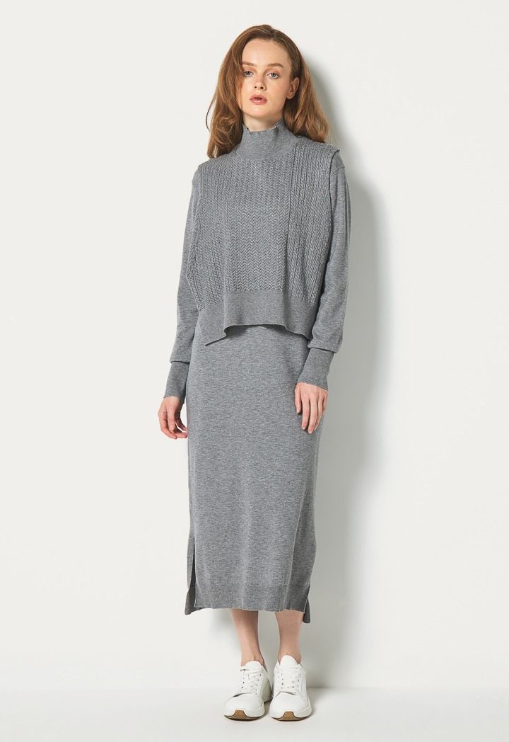 A plain knitted dress set with a high neck and a sleeveless vest for a warm winter.