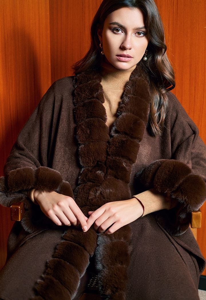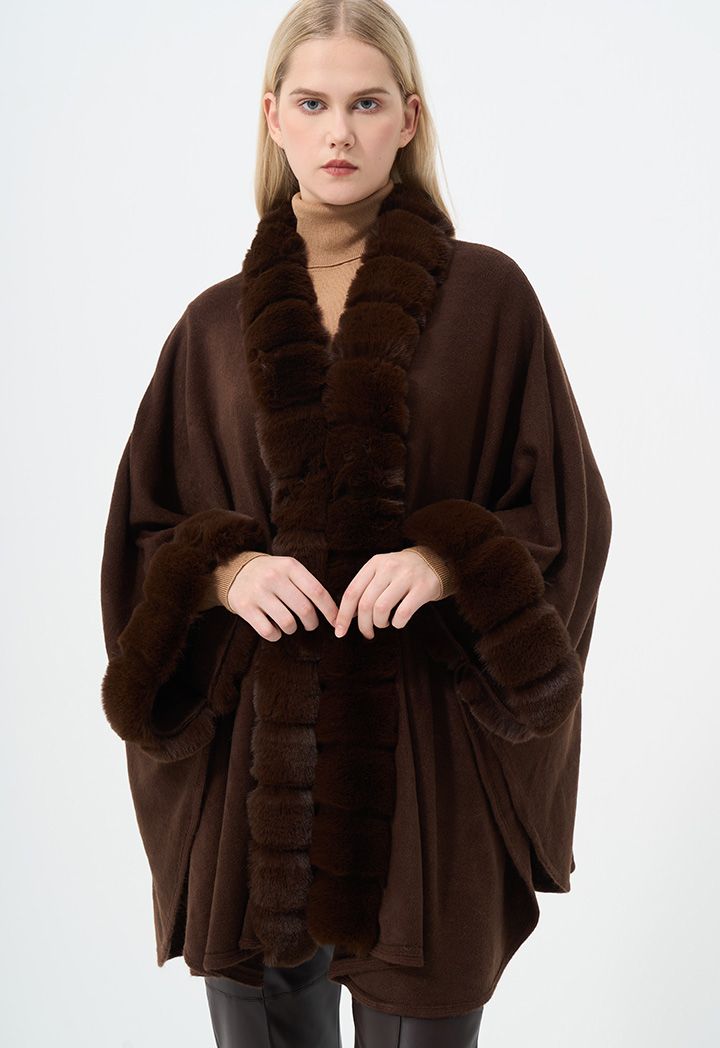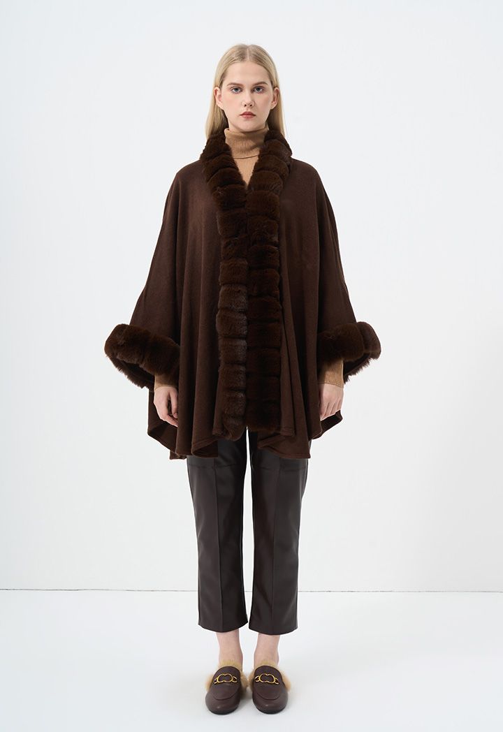 Cover your shoulders with this soft knitted poncho that features a solid and a faux fur embellished design.
