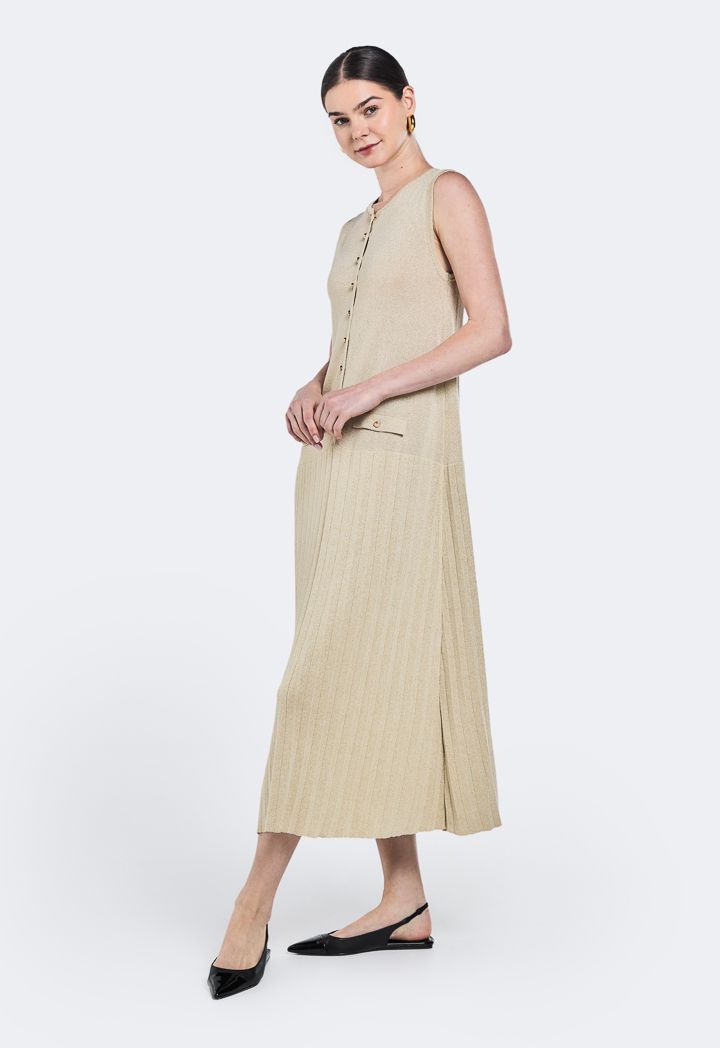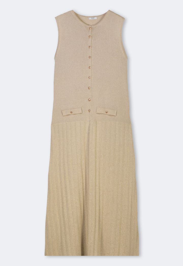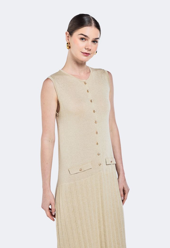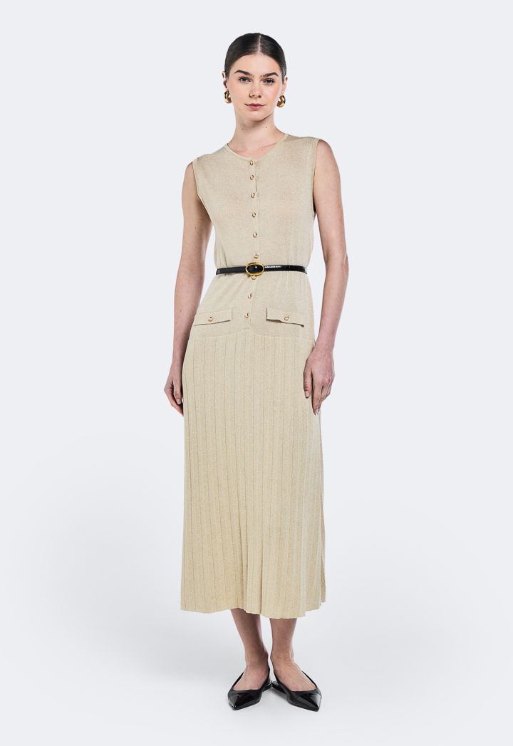 A fresh take on knitwear from Riva, this dress is made from glistening lurex stretch-knit with pleated skirt.