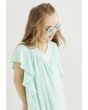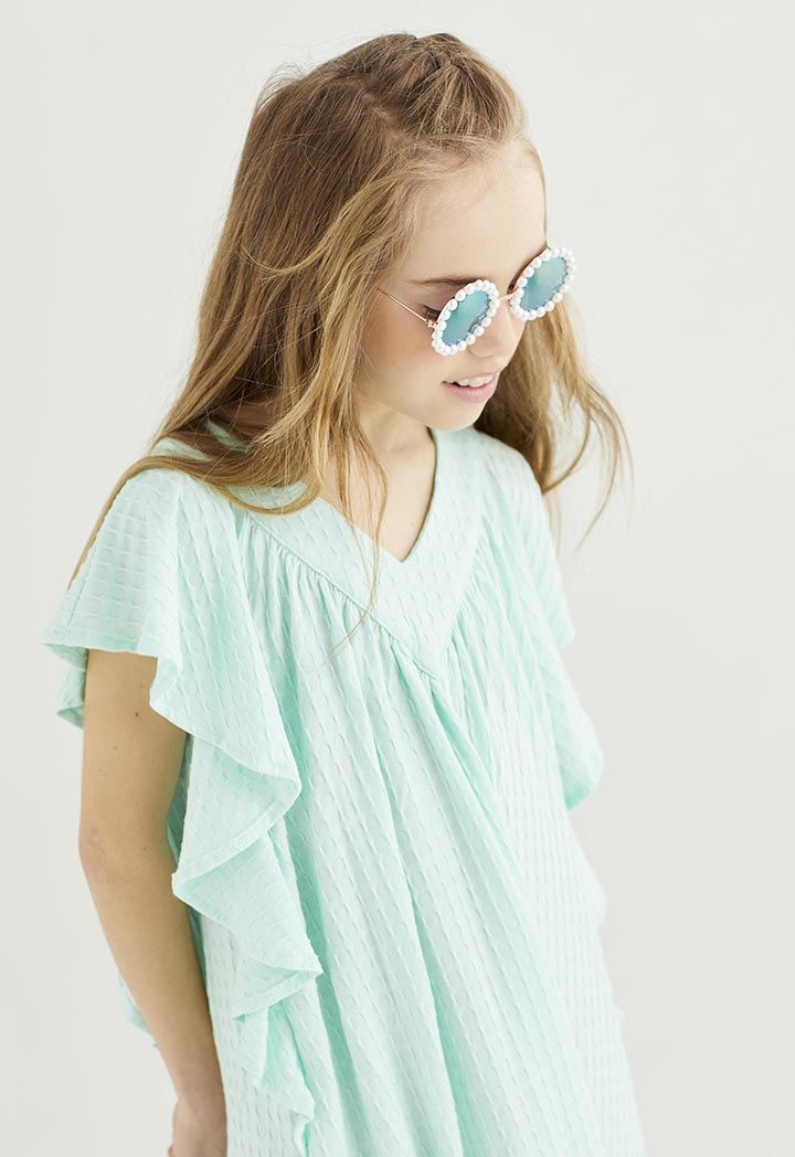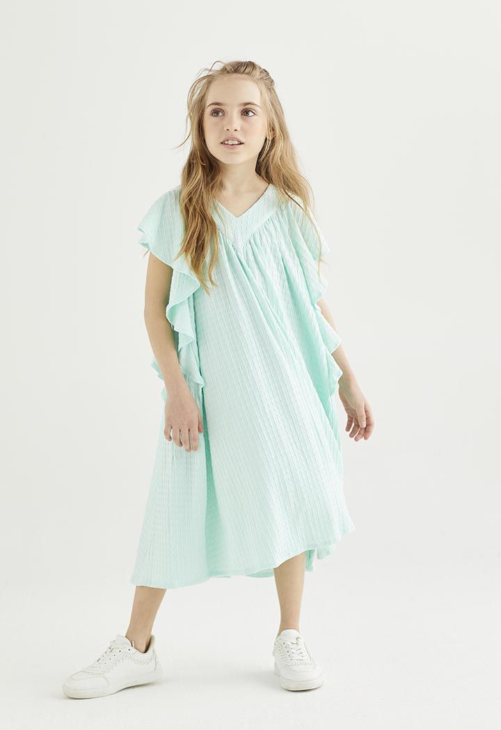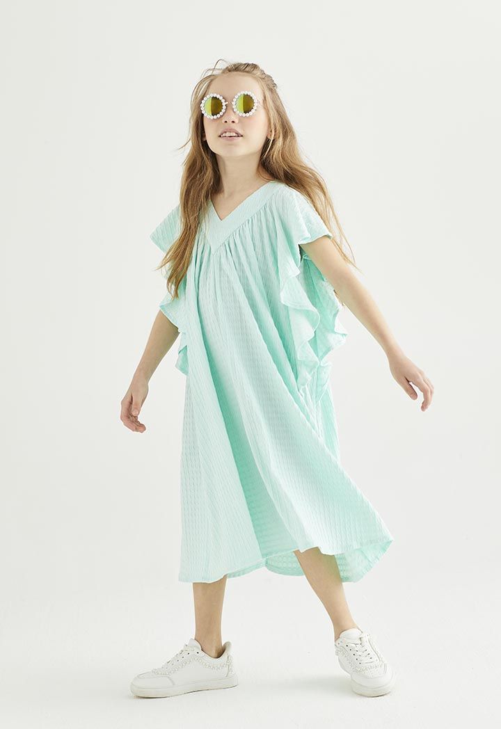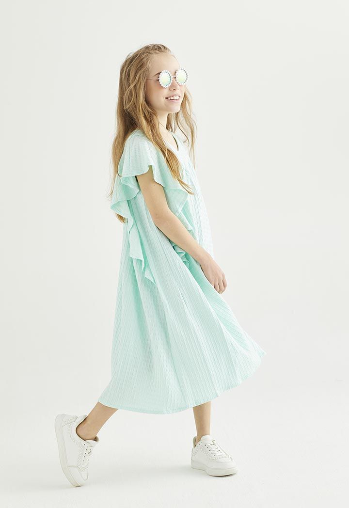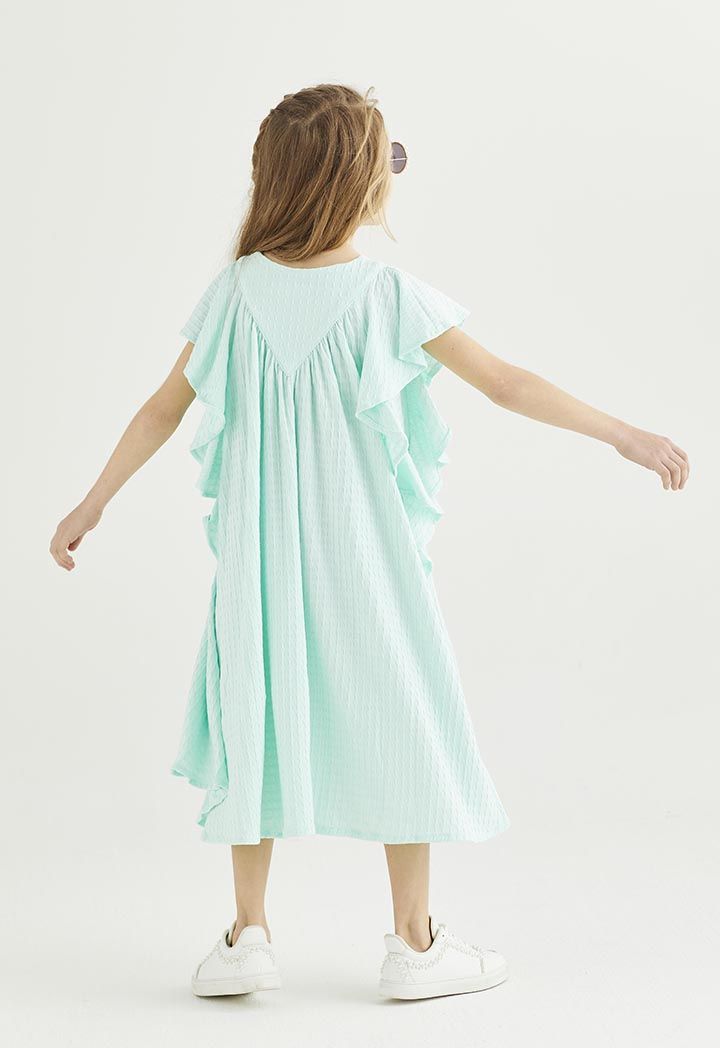 Dress up your girl with this Knitted Midi Dress. It features V- Neckline and Short Sleeves With Side Ruffles Details.