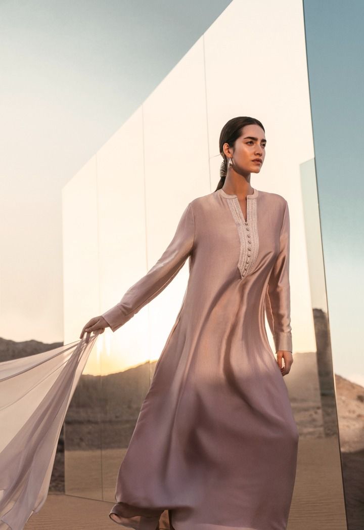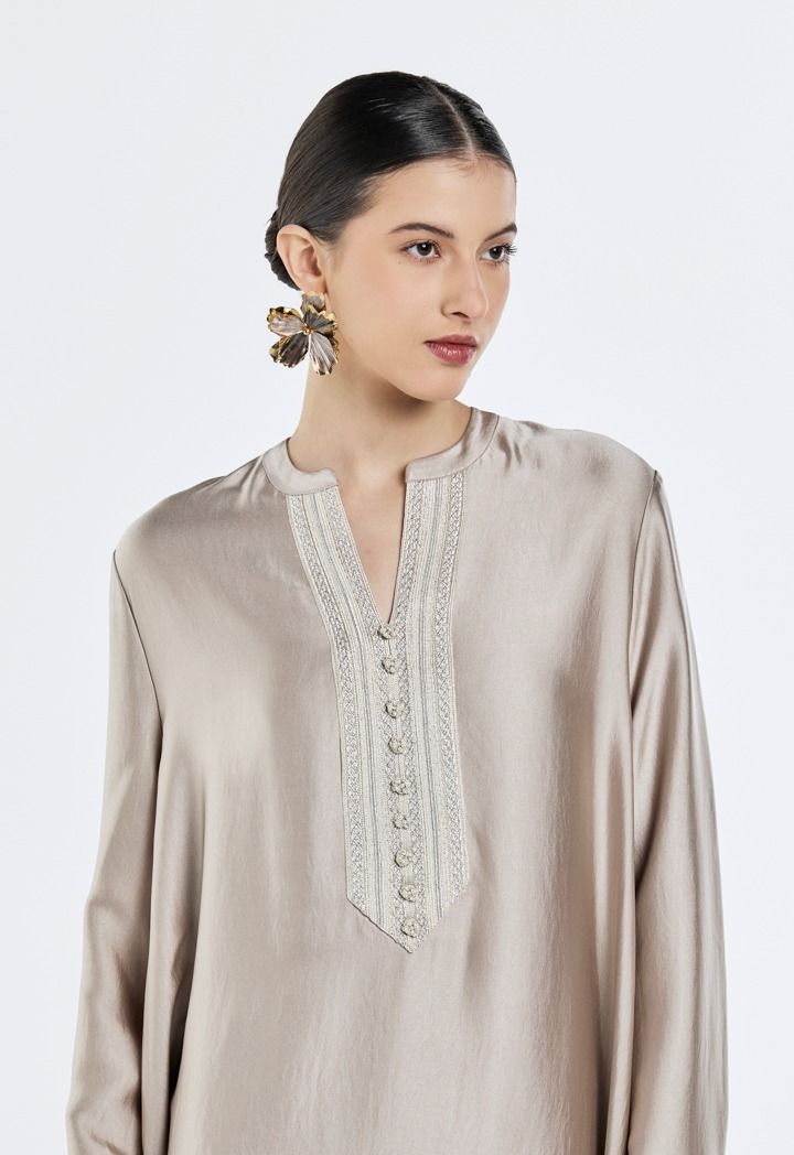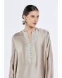 Refined and radiant, the lace-embellished satin kaftan brings effortless elegance to every occasion.