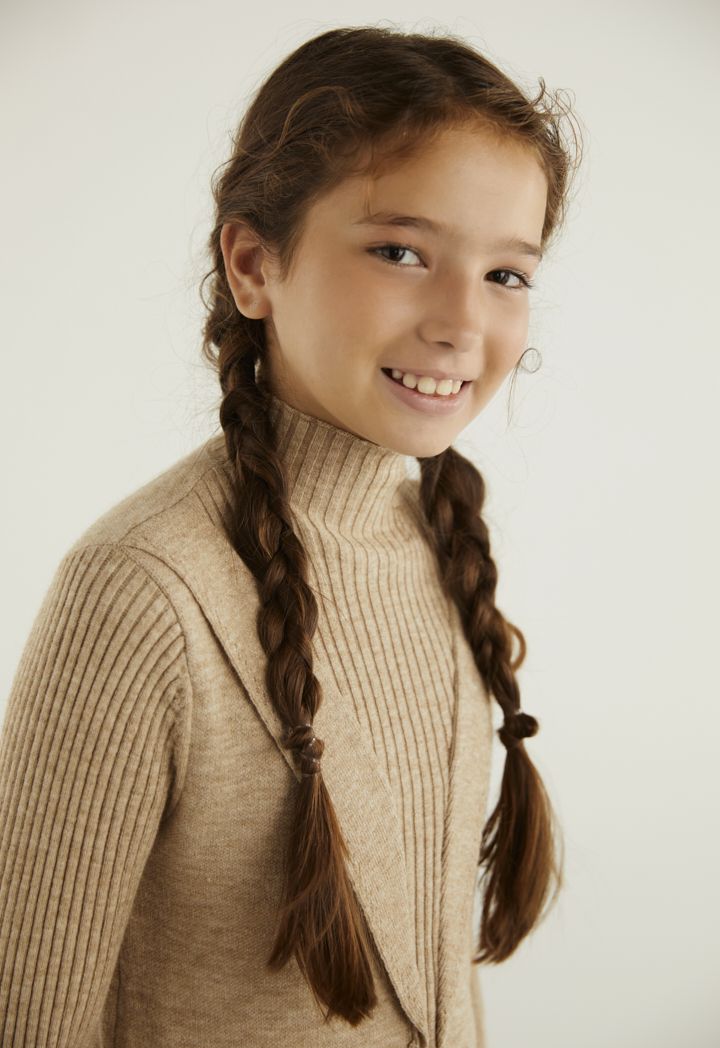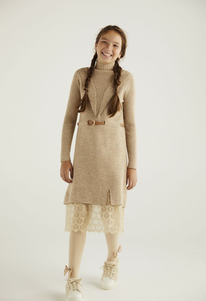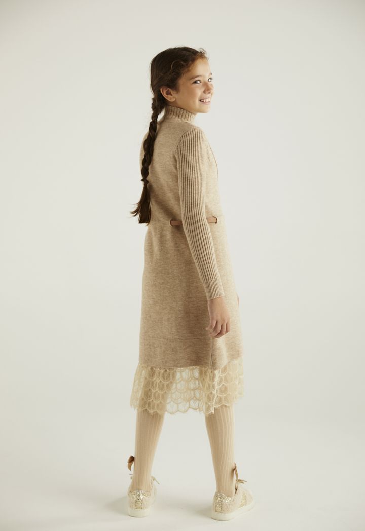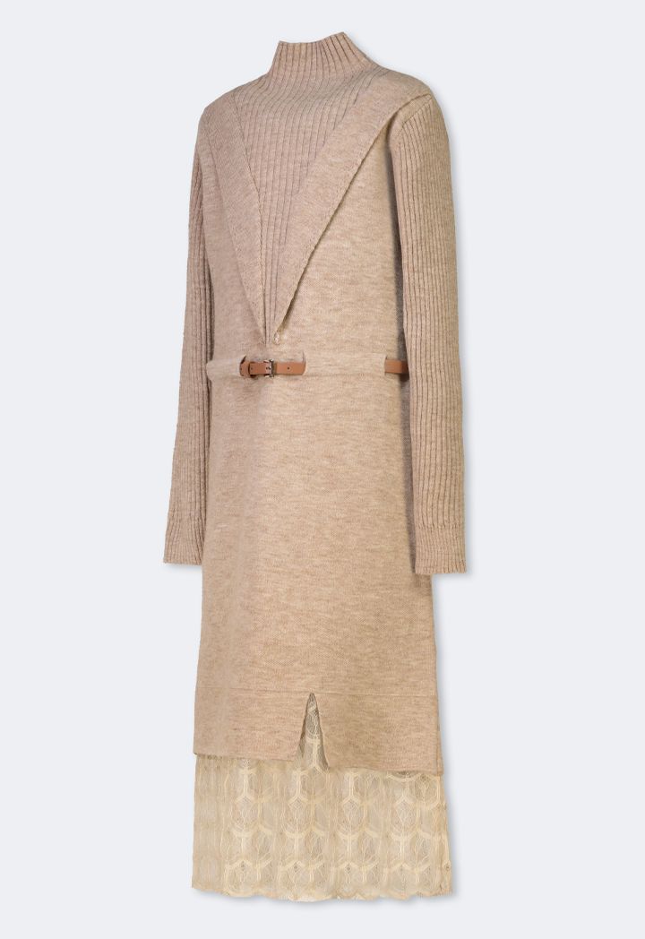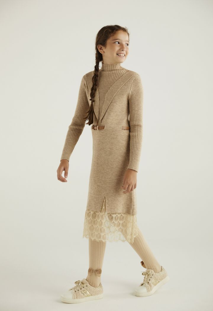 A modern yet elegant dress that combines the soft details of the lace touches with the soft knitted design.