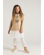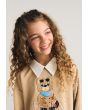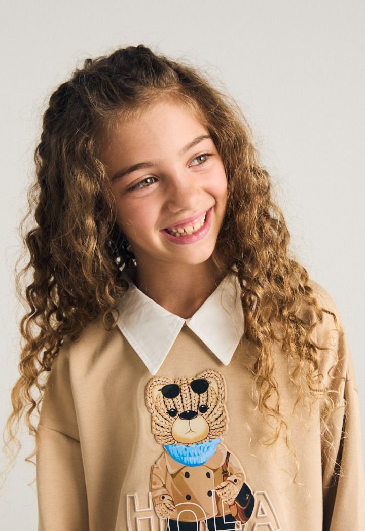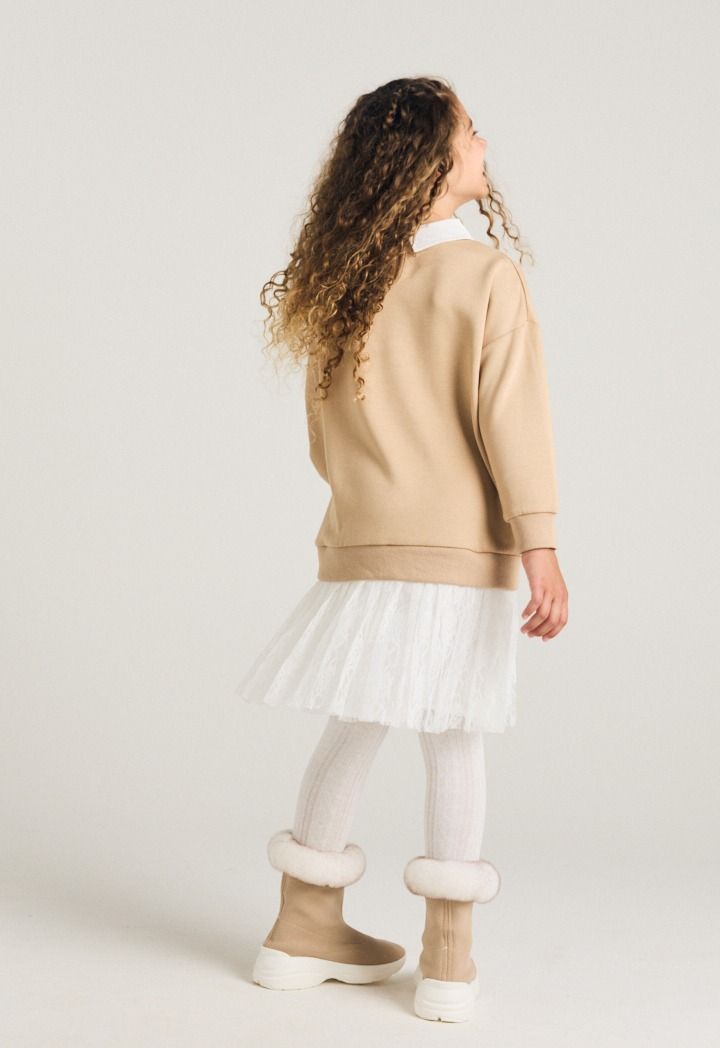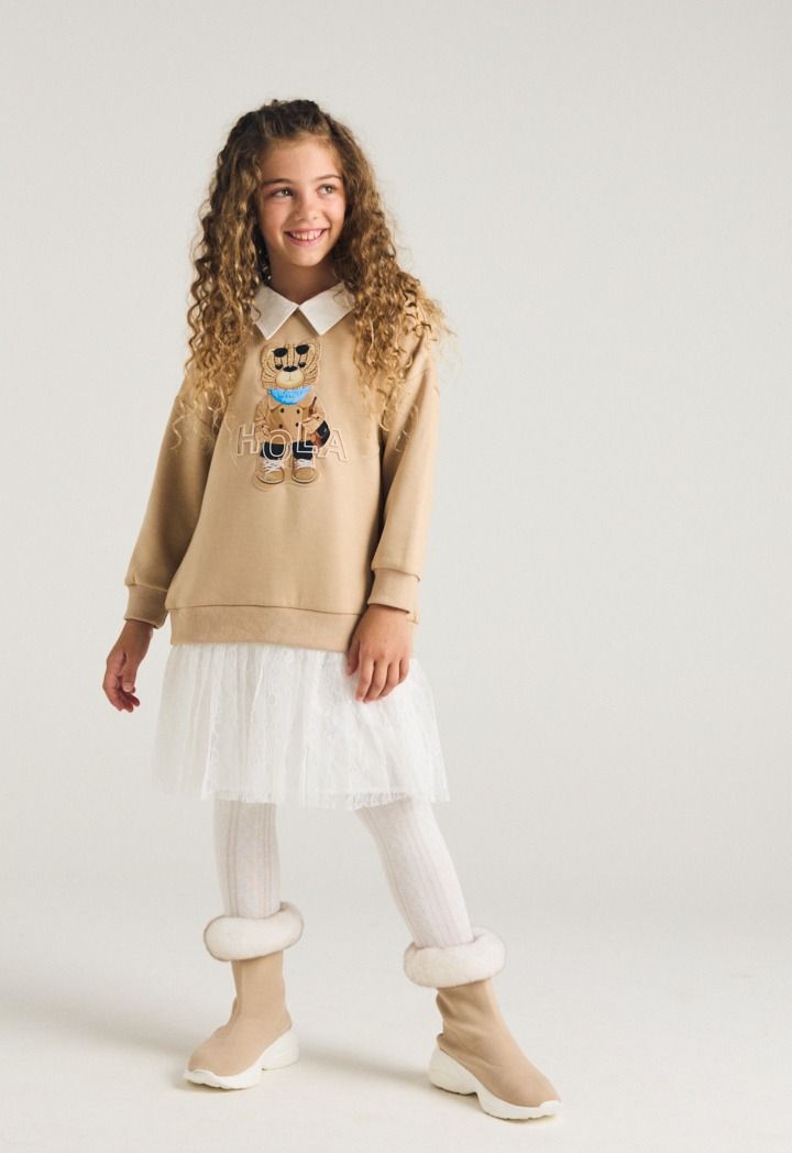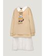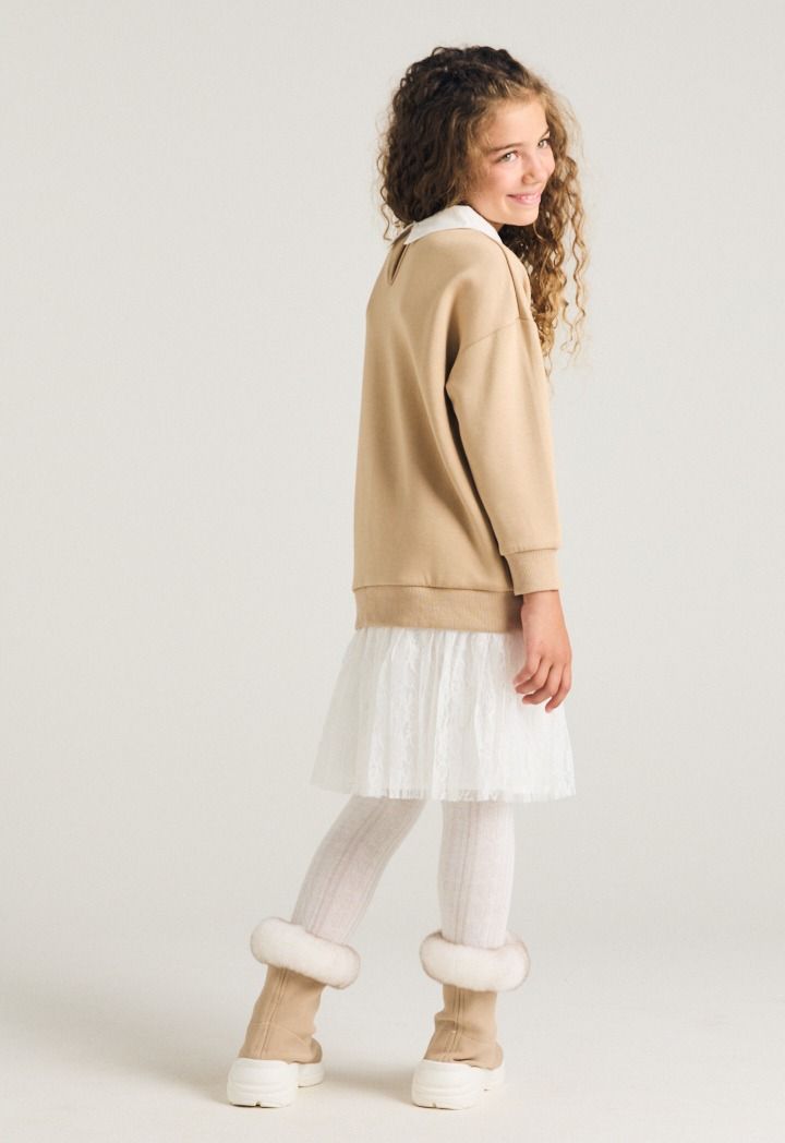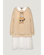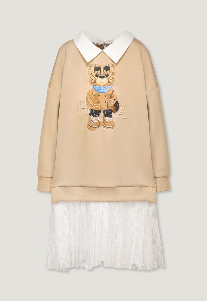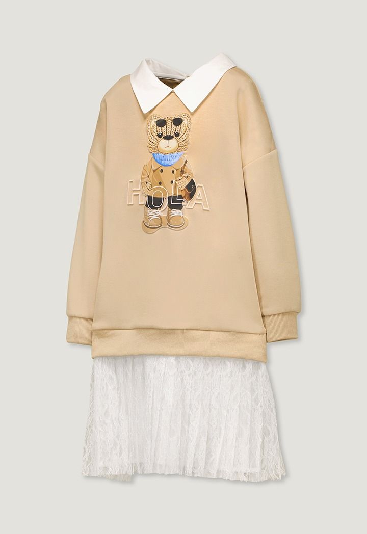 Embossed print knee-length dress with a pleated lace skirt both playful and elegant.