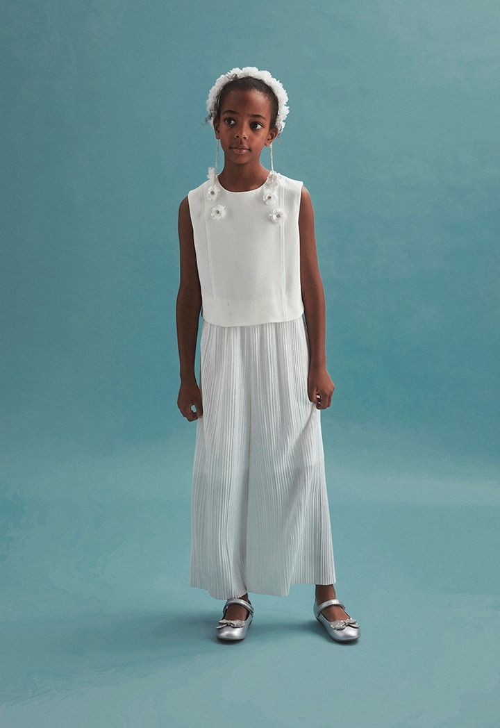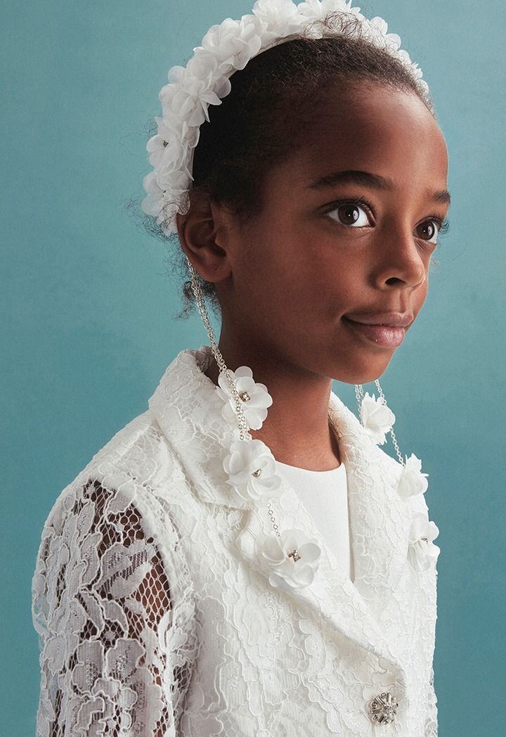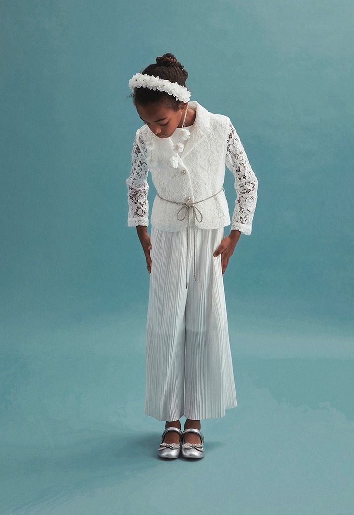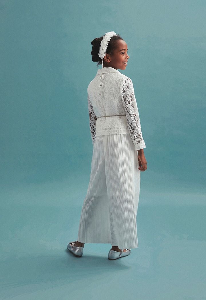 This classic yet unique jumpsuit with a lace jacket set will look elegant and timeless on your daughter.