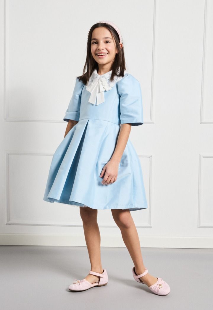 Sophisticated and chic, this trendy dress is a lovely addition to your daughter's wardrobe. It highlights an impressive design by the Lace and Pleated Details.