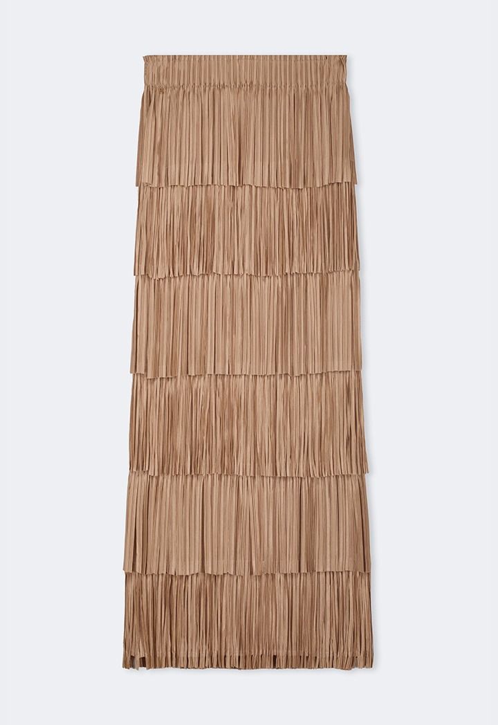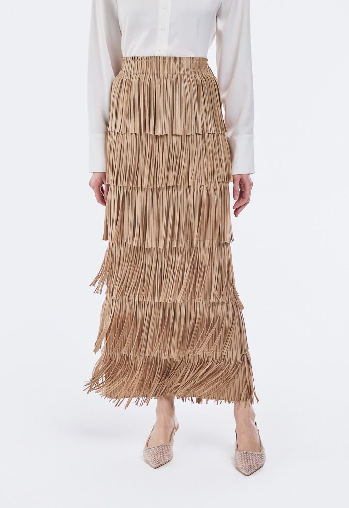 Elevate your look from simple to runway-ready with this chic skirt. The pleated details and individually attached panels create a fringed effect that moves with every step. A statement on its own, this skirt requires little else to turn heads.