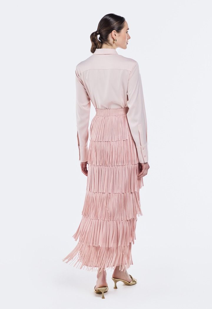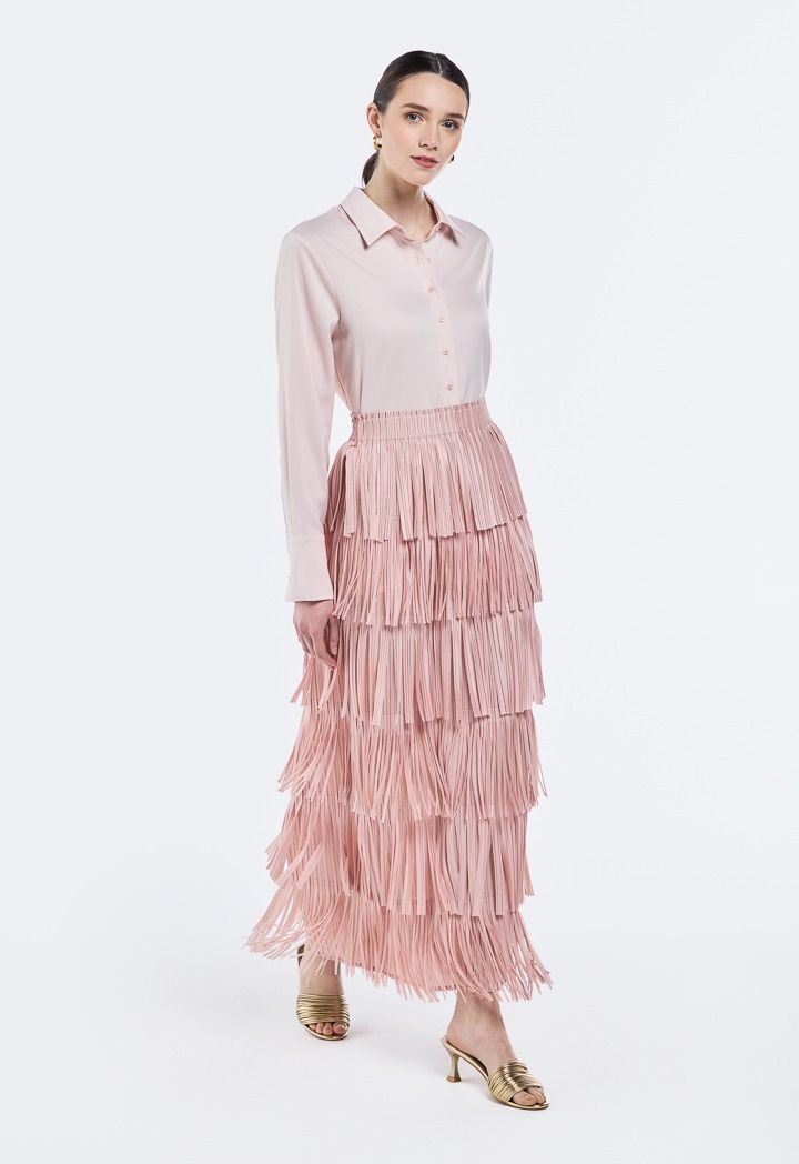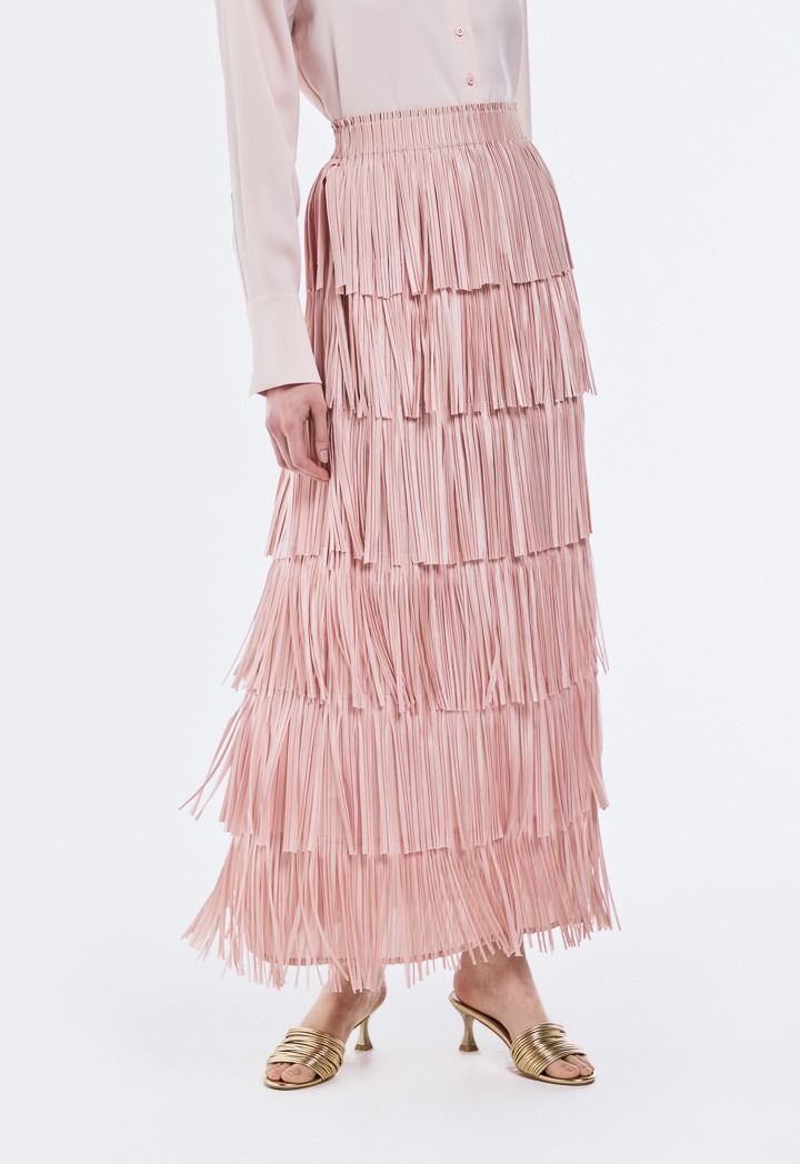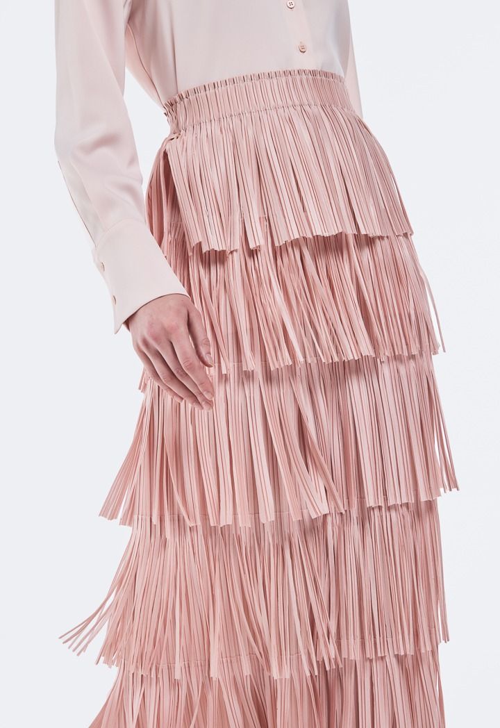 Elevate your look from simple to runway-ready with this chic skirt. The pleated details and individually attached panels create a fringed effect that moves with every step. A statement on its own, this skirt requires little else to turn heads.