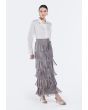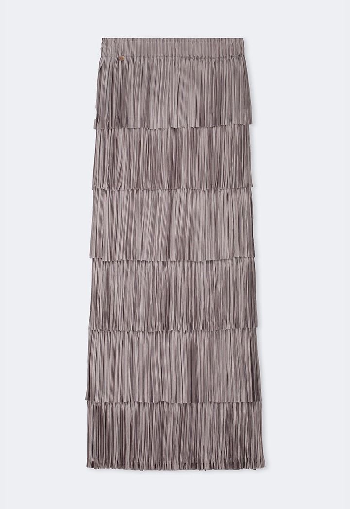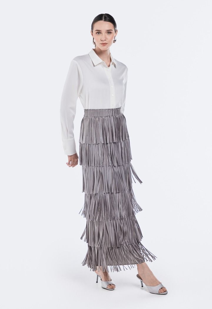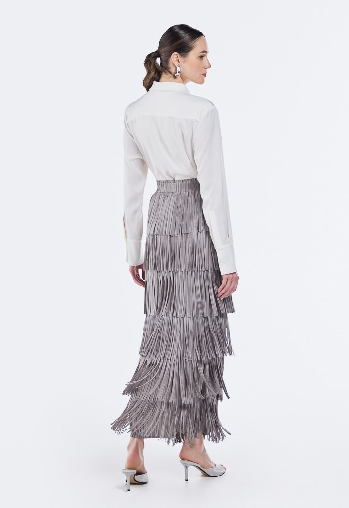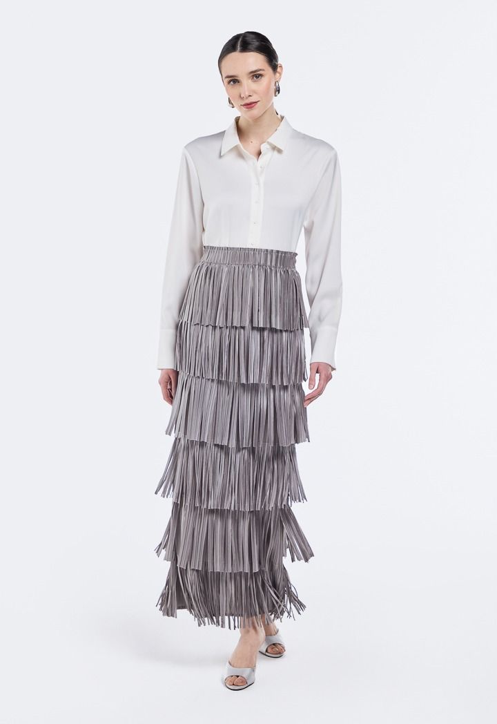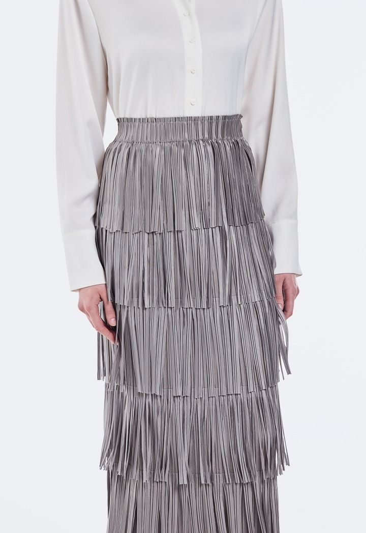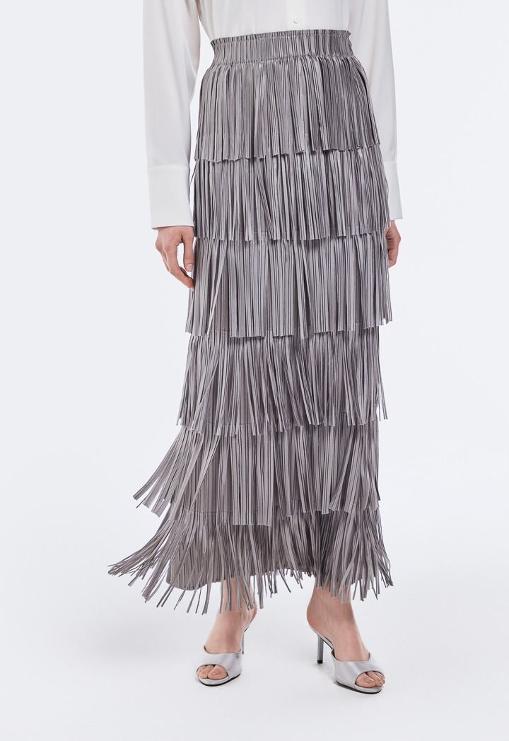 Elevate your look from simple to runway-ready with this chic skirt. The pleated details and individually attached panels create a fringed effect that moves with every step. A statement on its own, this skirt requires little else to turn heads.
