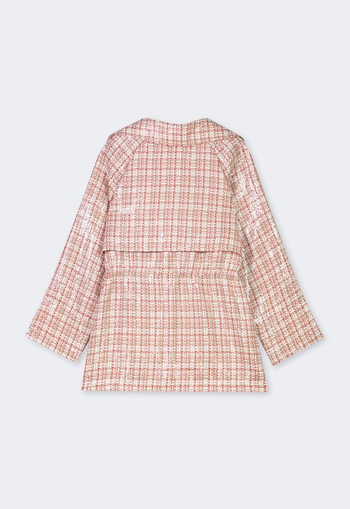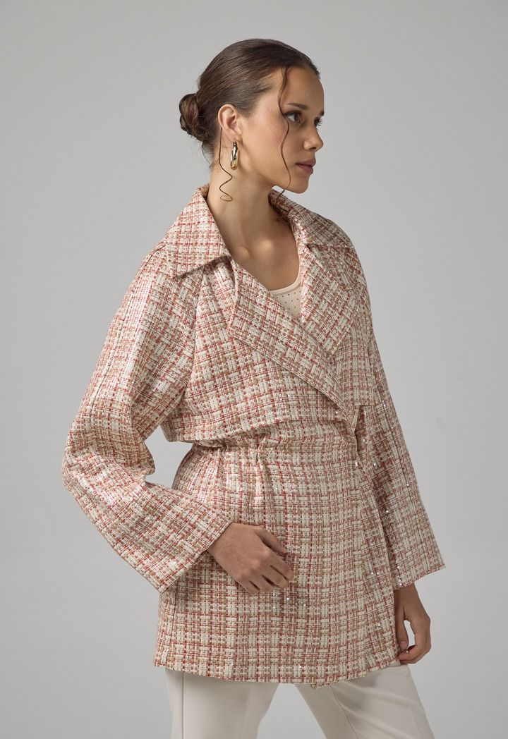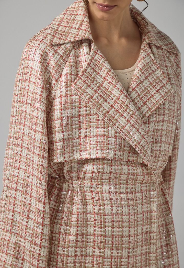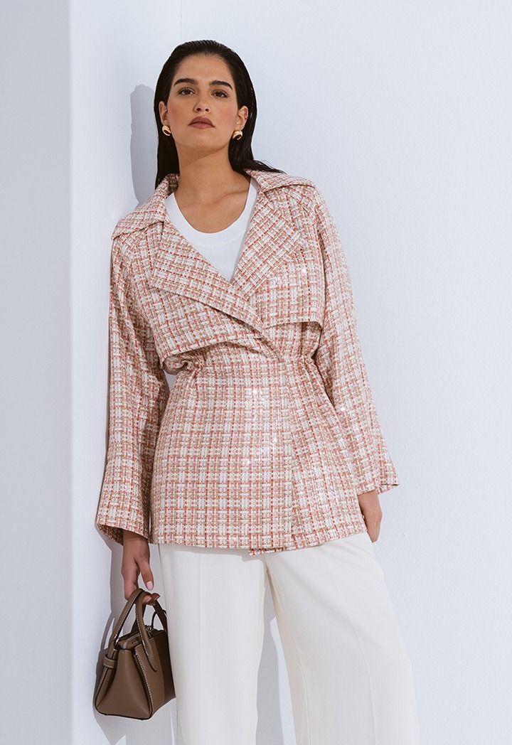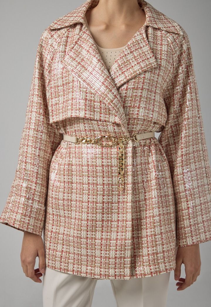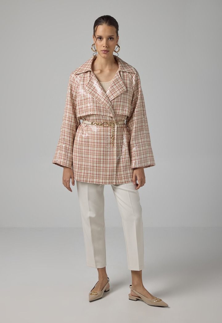 Design: Multi-Color, Tweed, Sequin, Drawstring Waist Inside, Double Breasted, Storm Flap