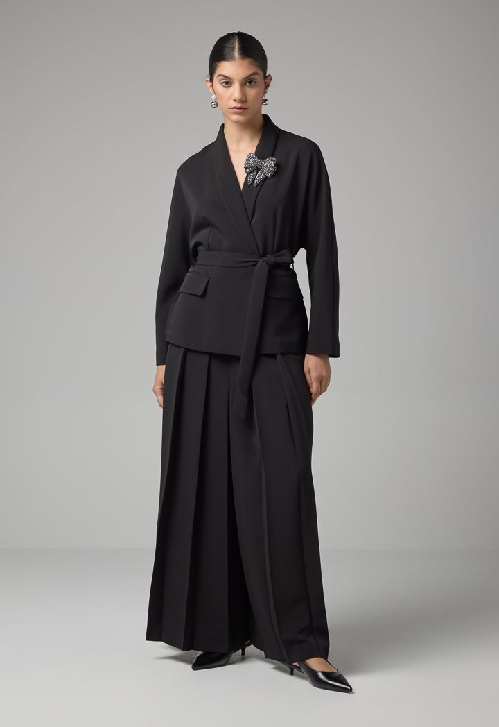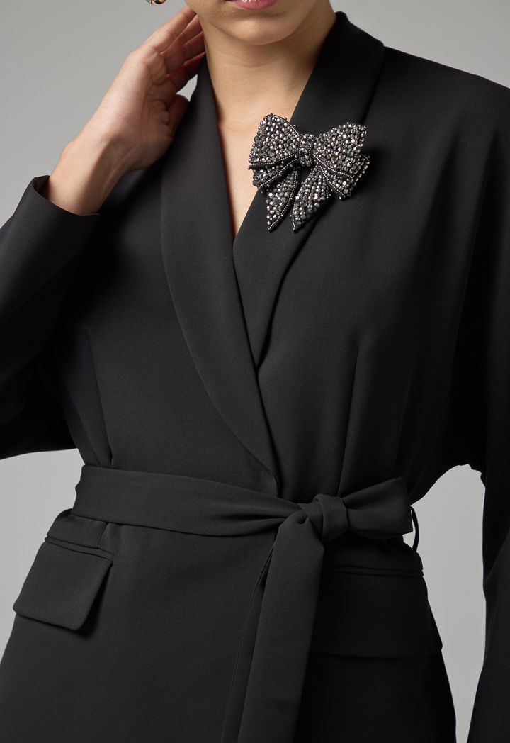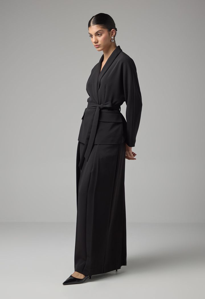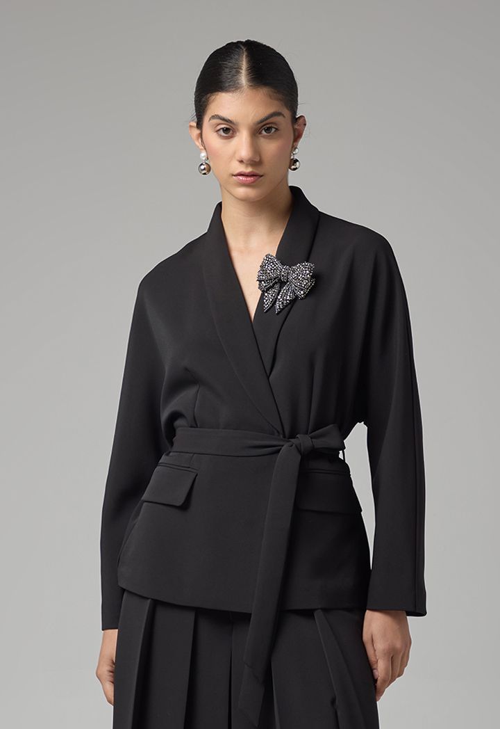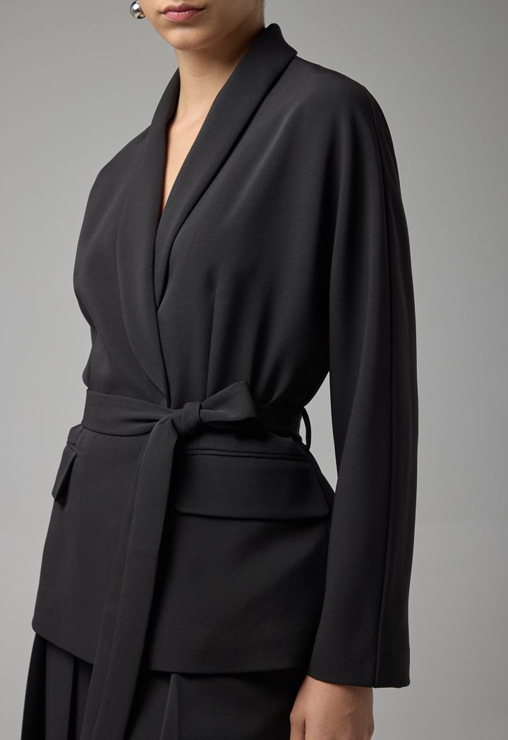 Design: Solid, Front Flap Pockets, Self Fabric Belt, Attached Lining