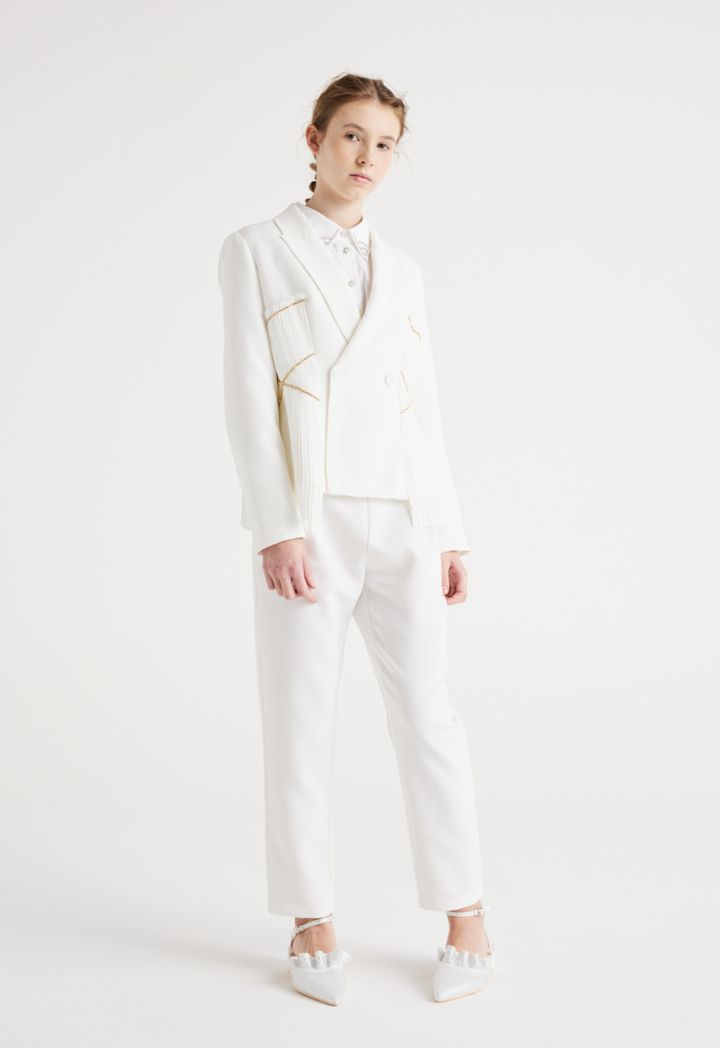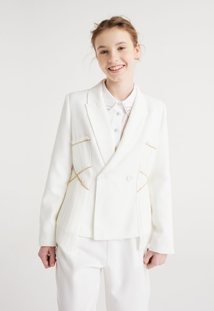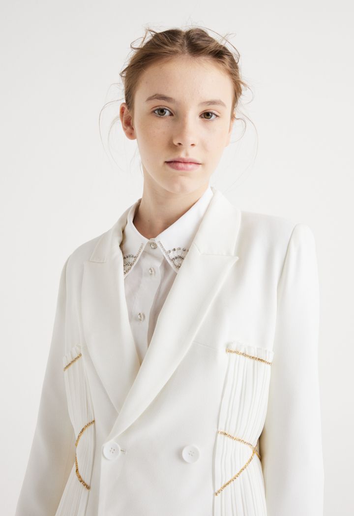 This blazer is the perfect choice for your daughters Eid look, featuring a lurex pleated blazer that is both stylish and modest.