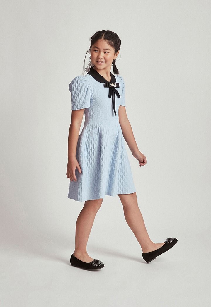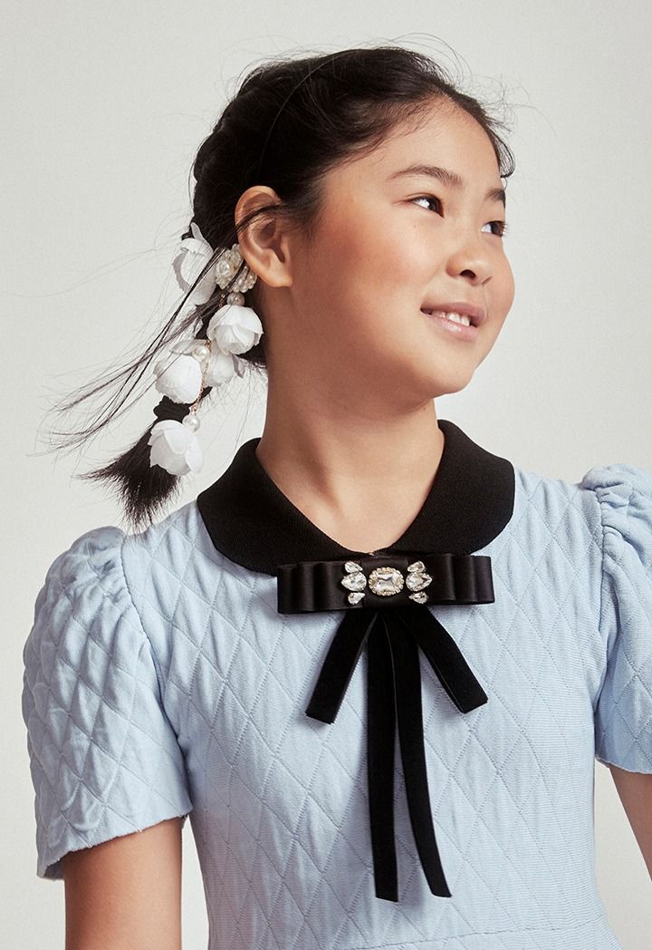 A classic dress that features a rhinestones bow embellished brooch and a lurex design.