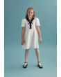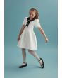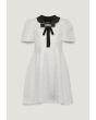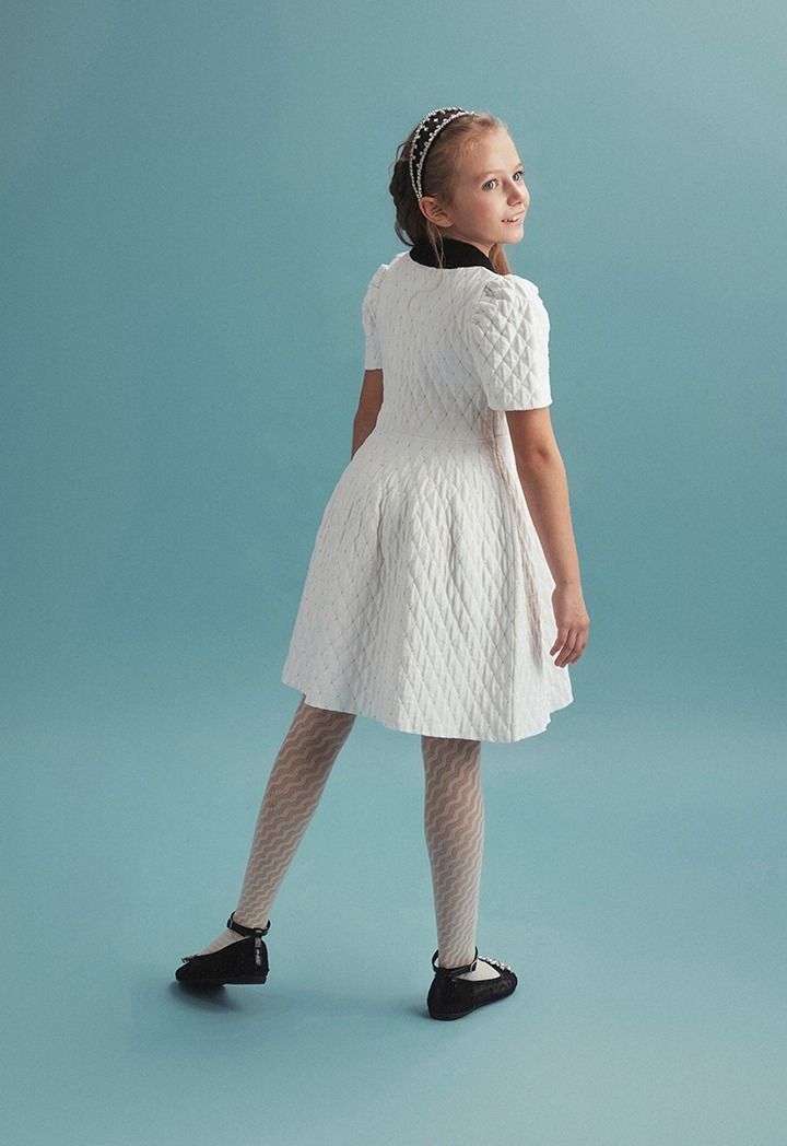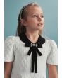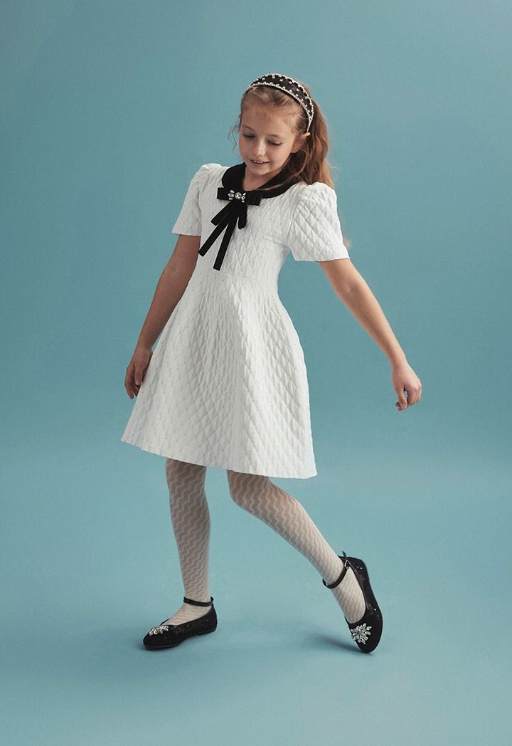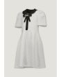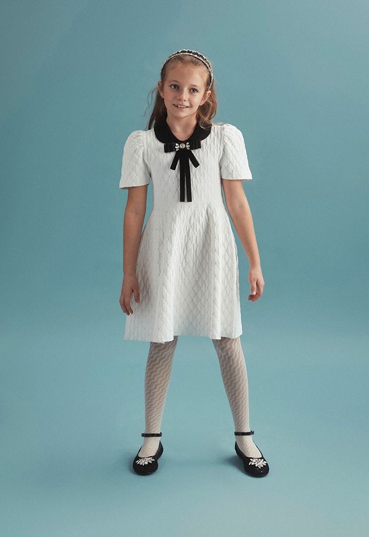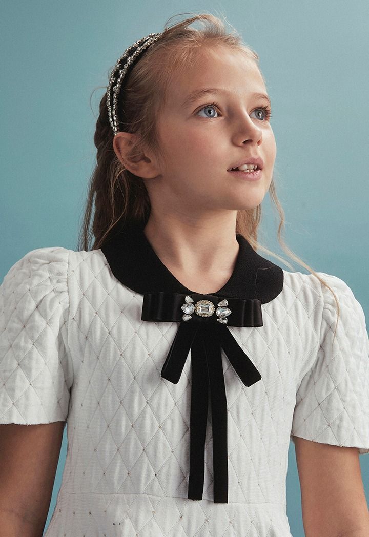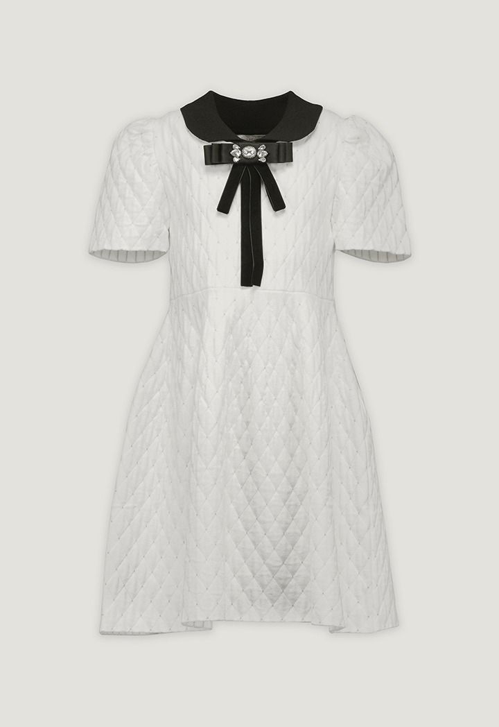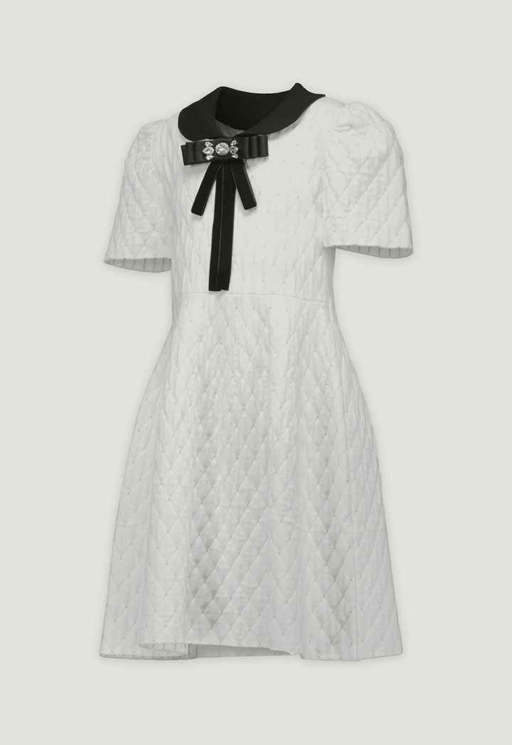 A classic dress that features a rhinestones bow embellished brooch and a lurex design.