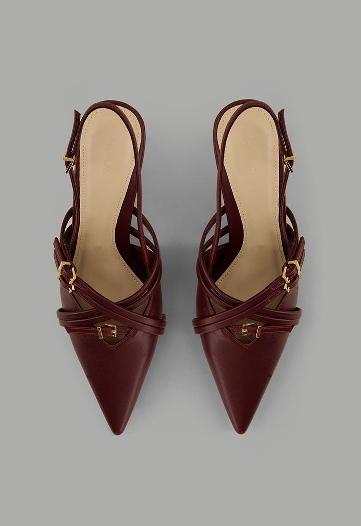 A pair of modern heels that features a matte buckled strap design that is on trend.
