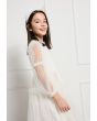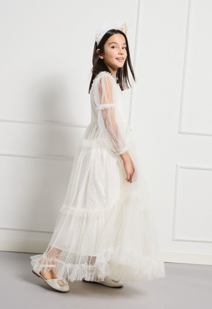 Add a touch of movement to your daughters closet with this drop waist dress with a polka dot mesh design.