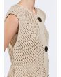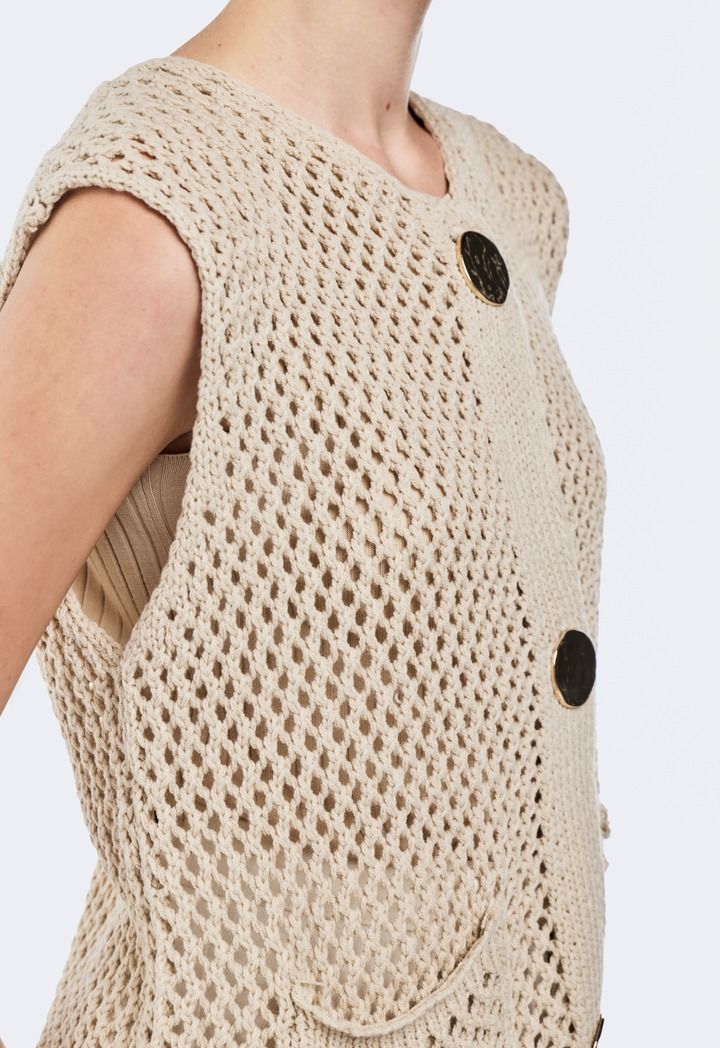 Chic crochet vest adorned with large metallic buttons for a touch of elegance .