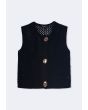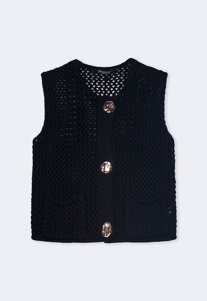 Chic crochet vest adorned with large metallic buttons for a touch of elegance .
