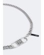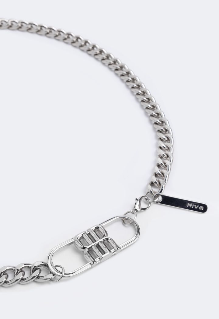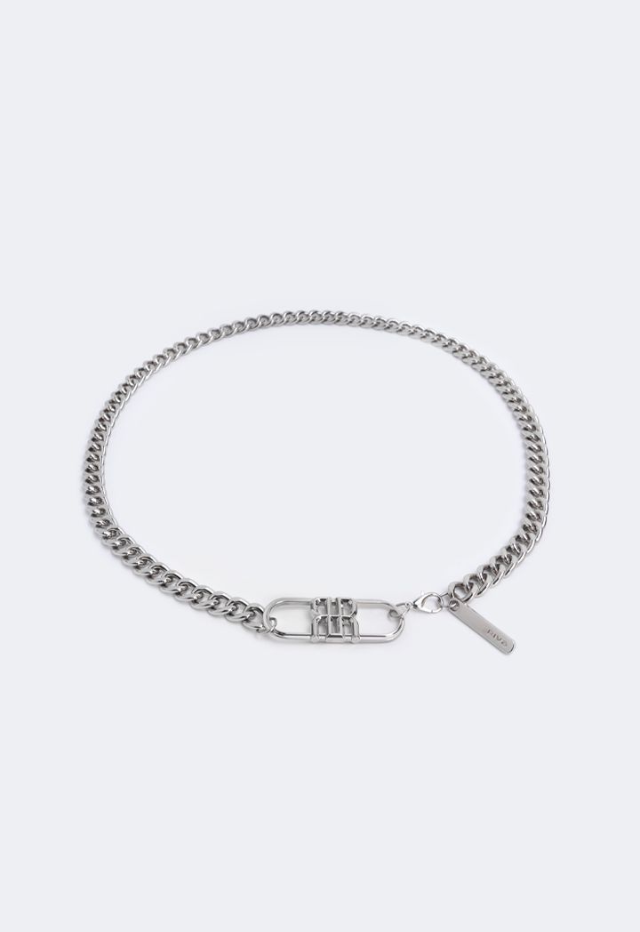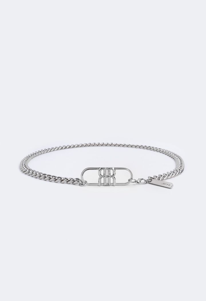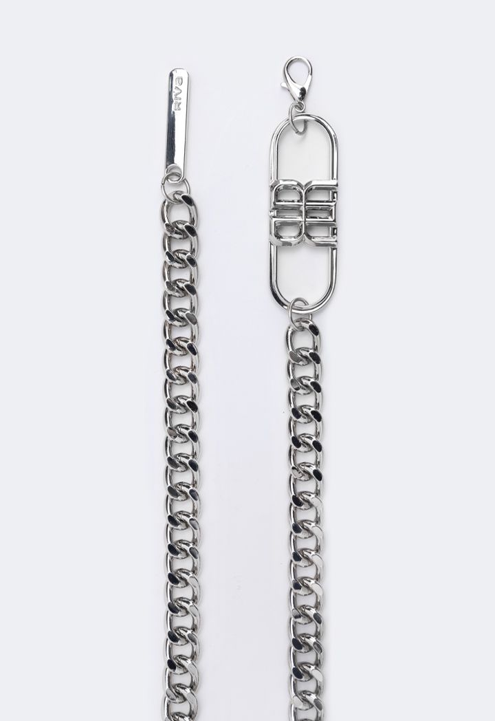 A unique belt that features a metallic chain design and a monogram lobster claw closure.