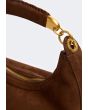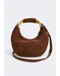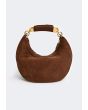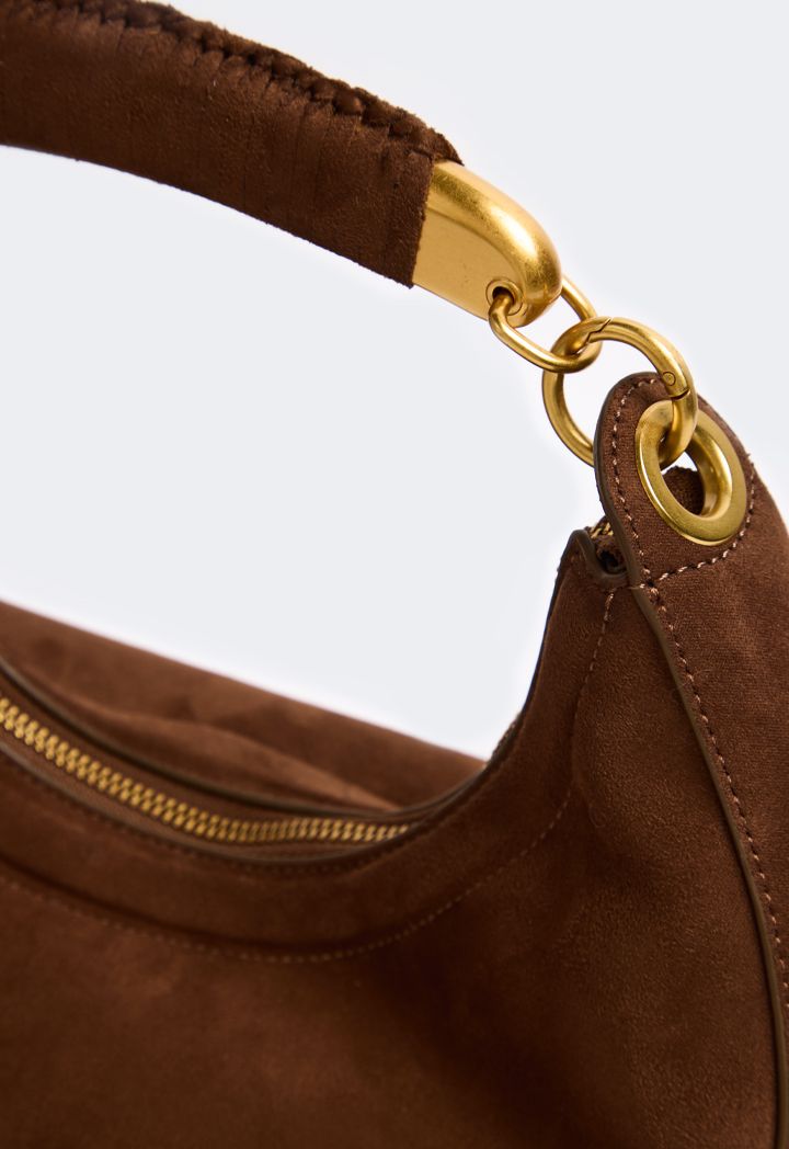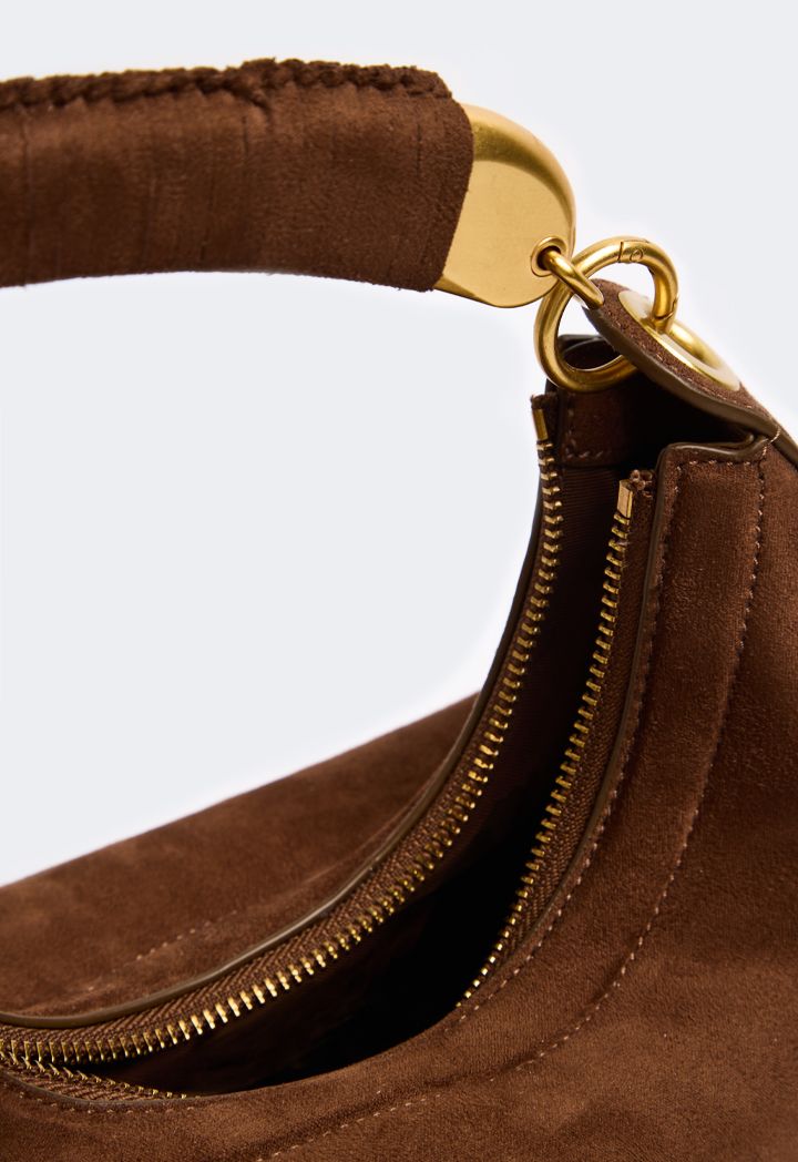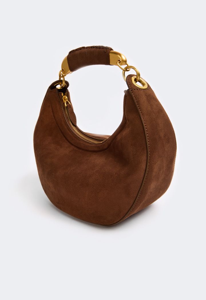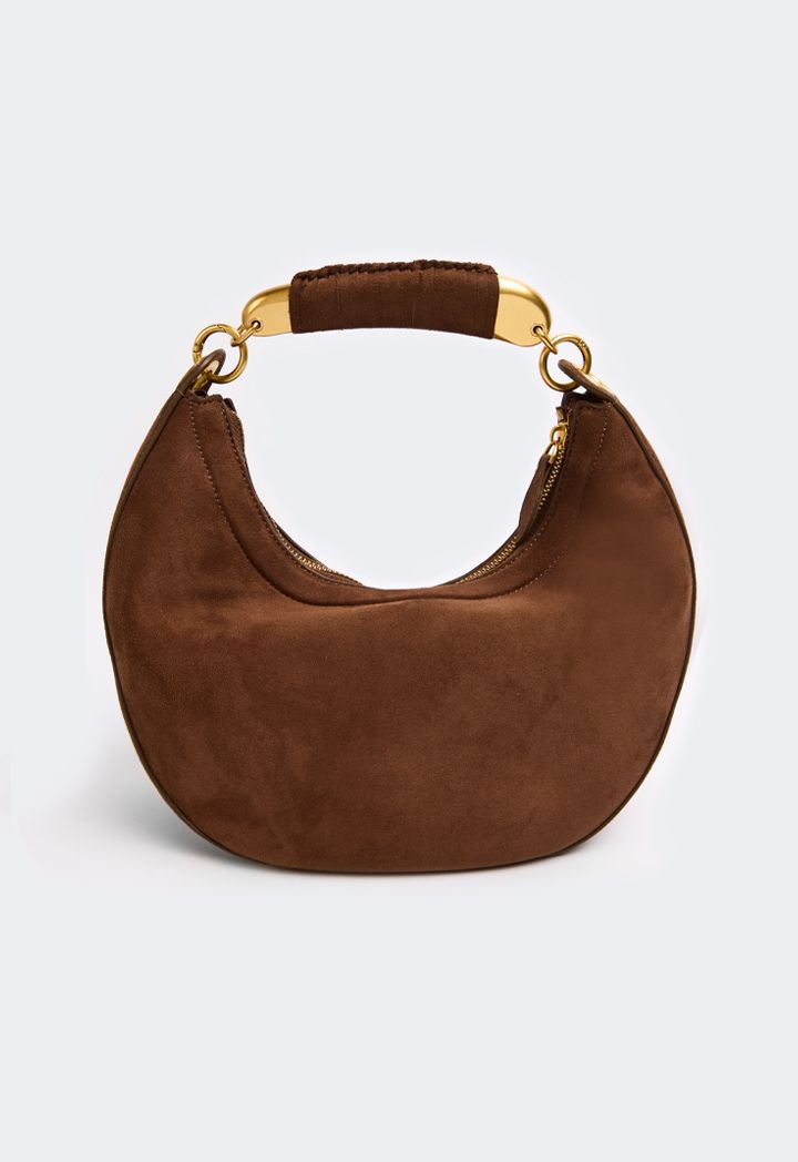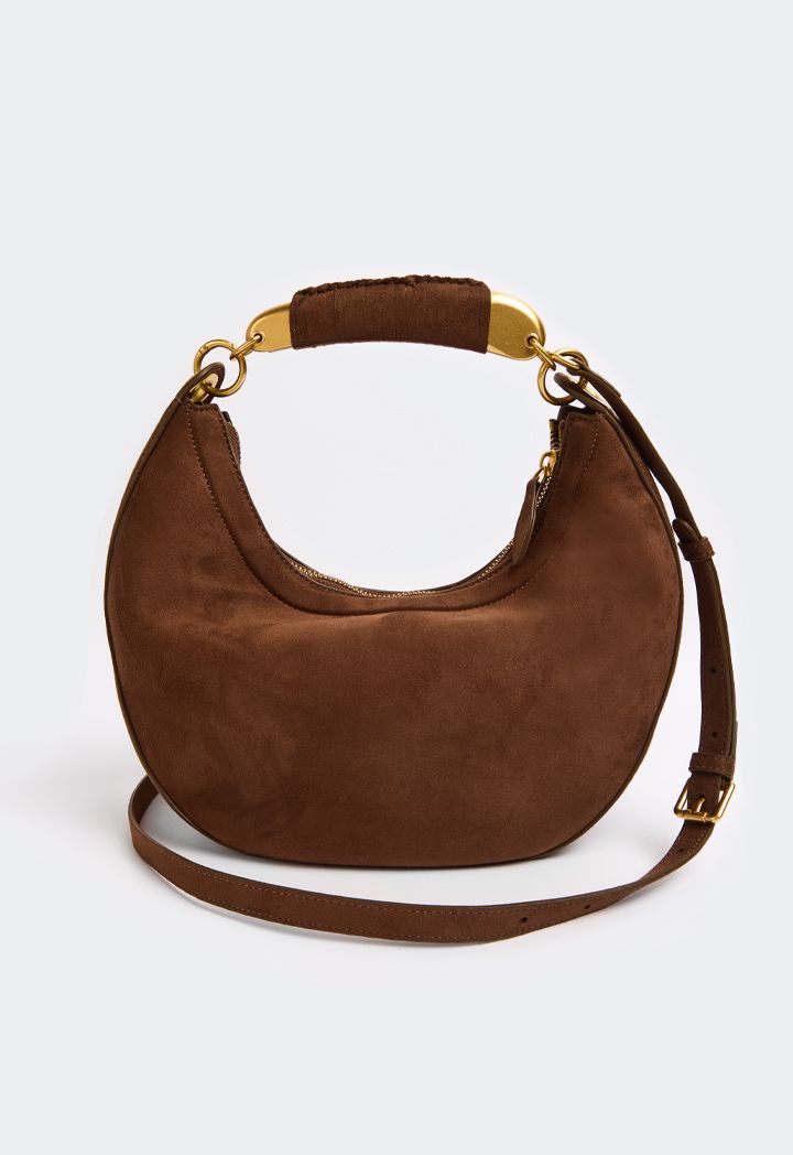 A modern handbag that features a suede wrapped top handle and a sleek suede design.