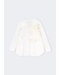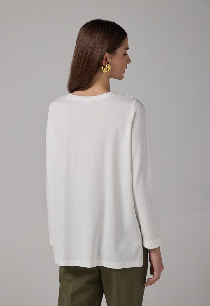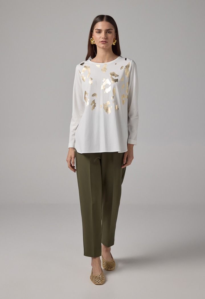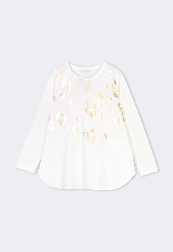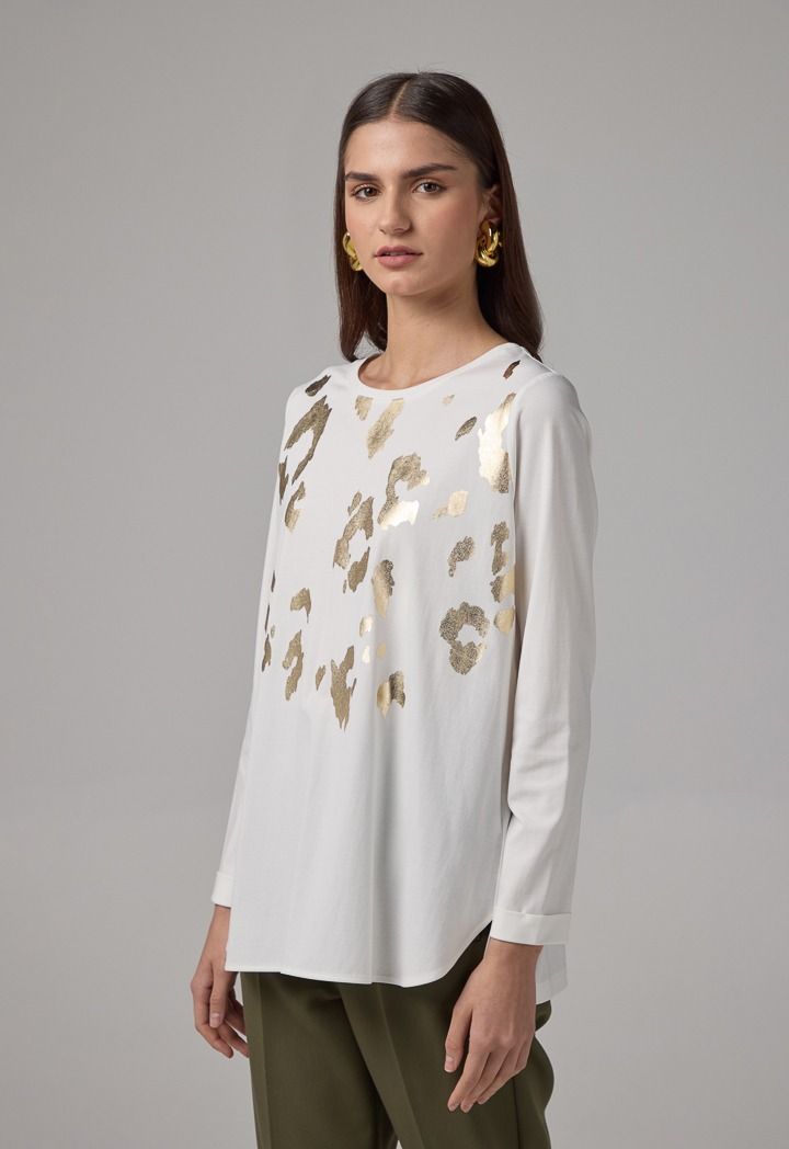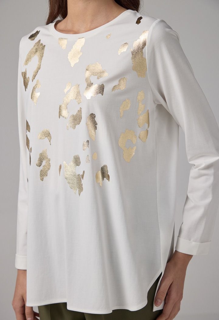 Discover your elegance with a long sleeved t shirt featuring a mitallic print adding a trendy and unique touch to your look.