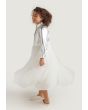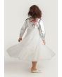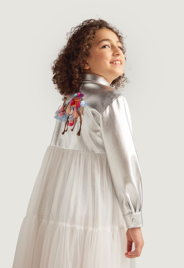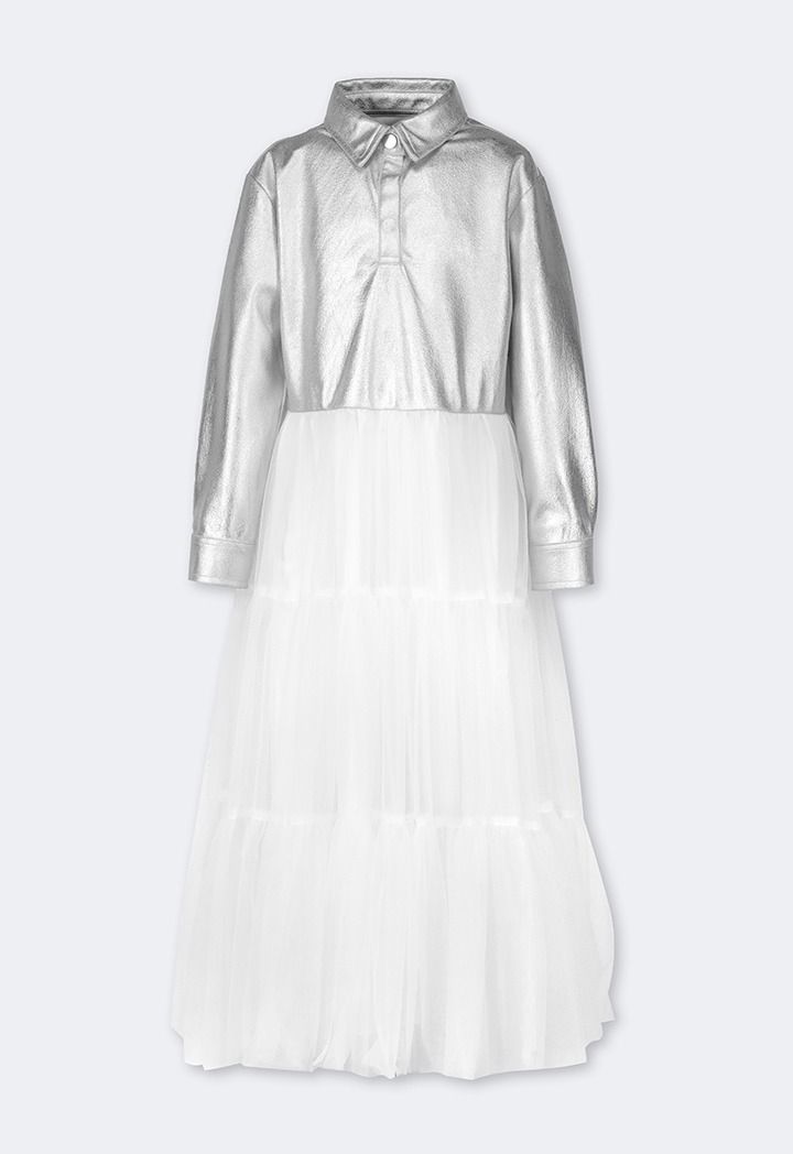 A unique dress that features a metallic top and a tiered mesh skirt.