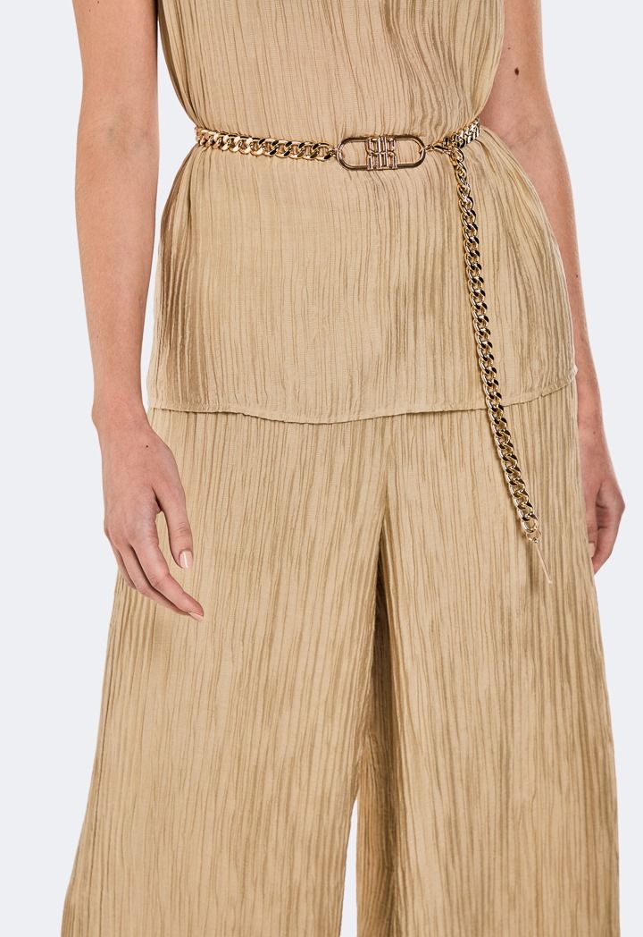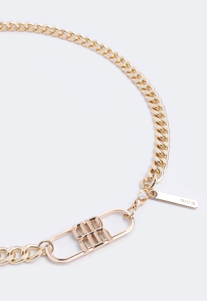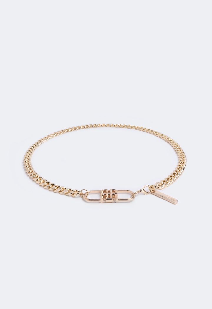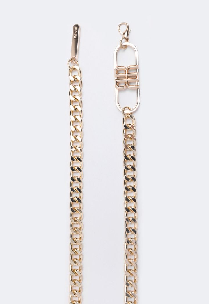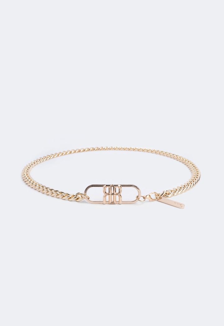 A unique belt that features a metallic chain design and a monogram lobster claw closure.