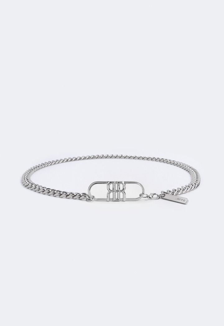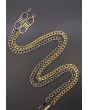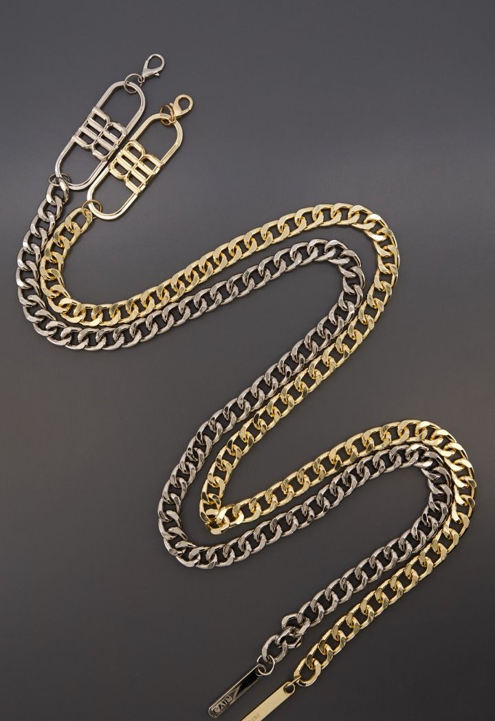 A unique belt that features a metallic chain design and a monogram lobster claw closure.