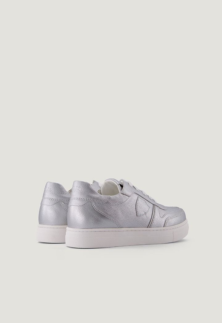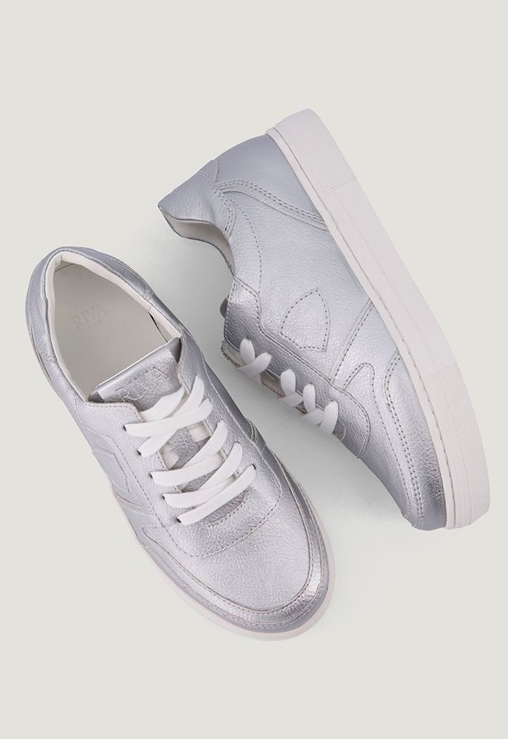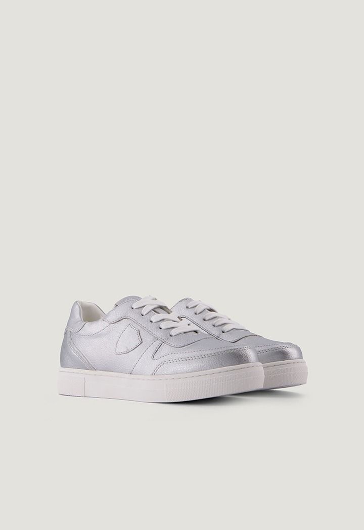 A pair of modern flat sneakers that feature a metallic design.