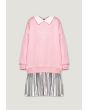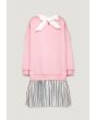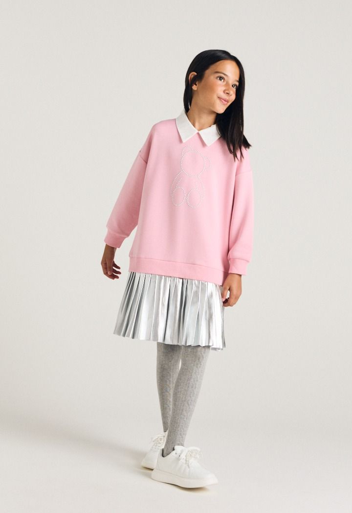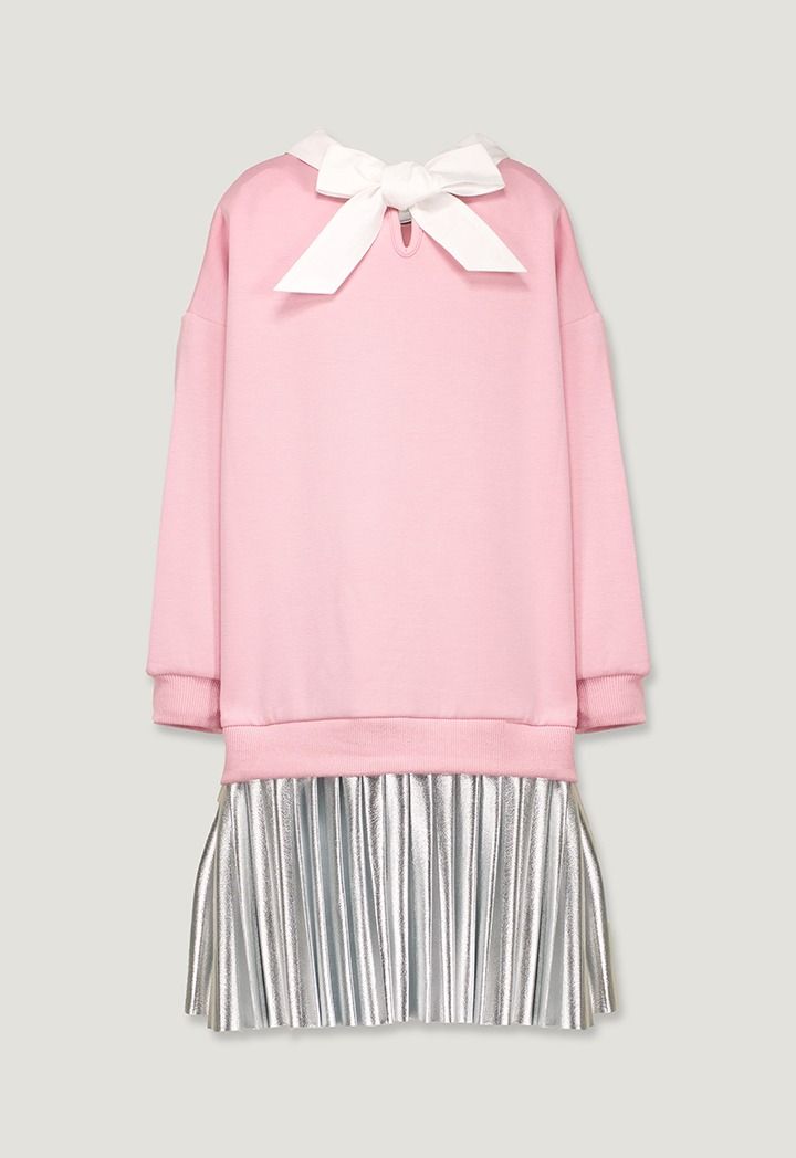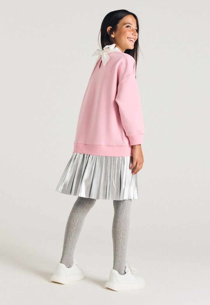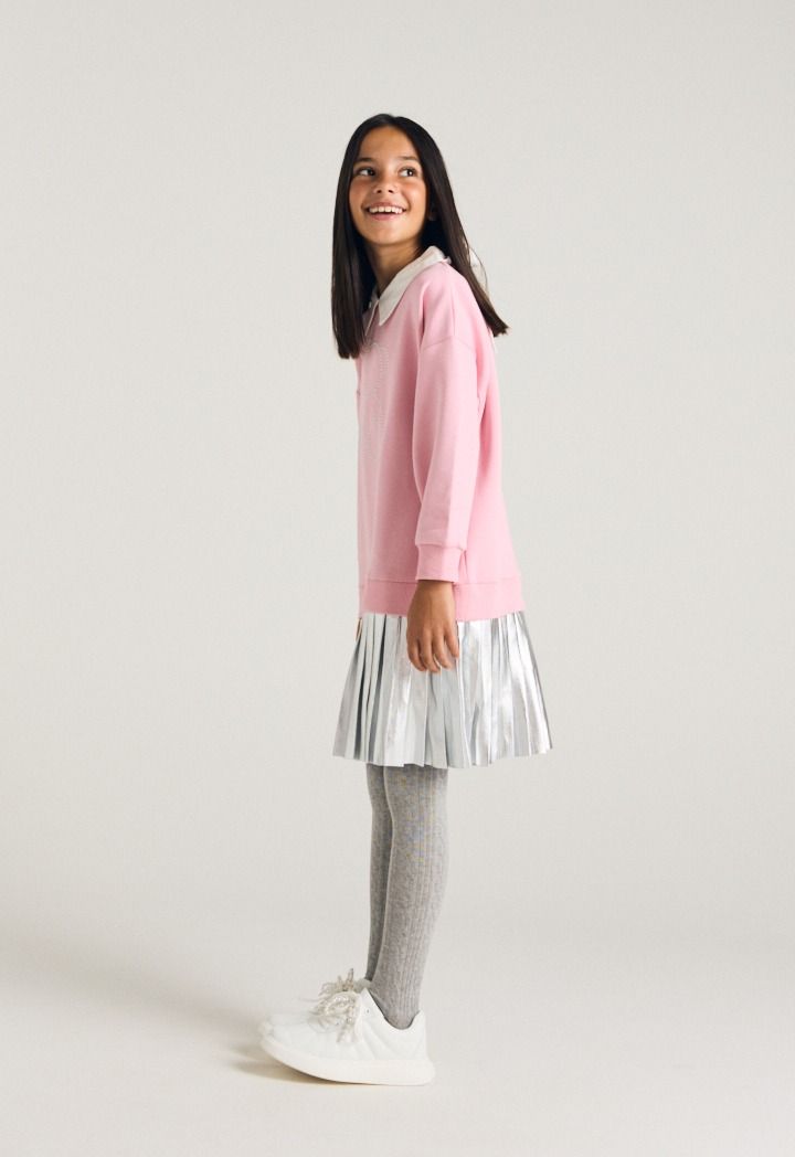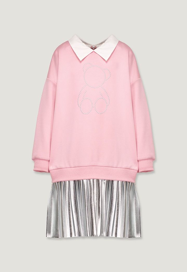 A sweater dress that features a studded bodice and a metallic pleated skirt.
