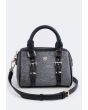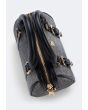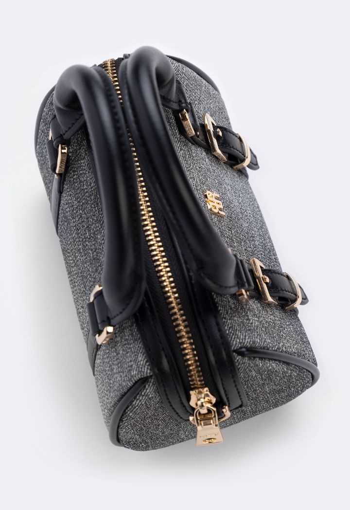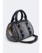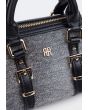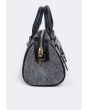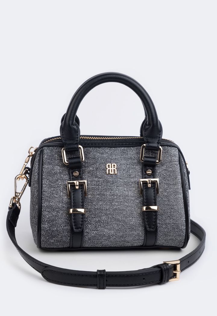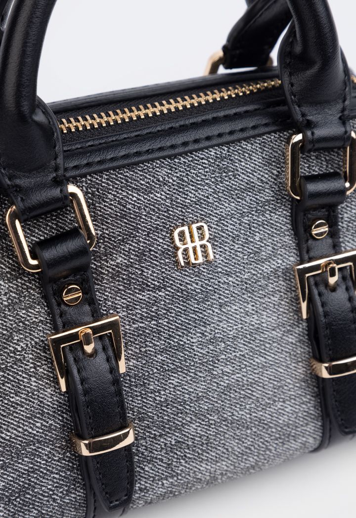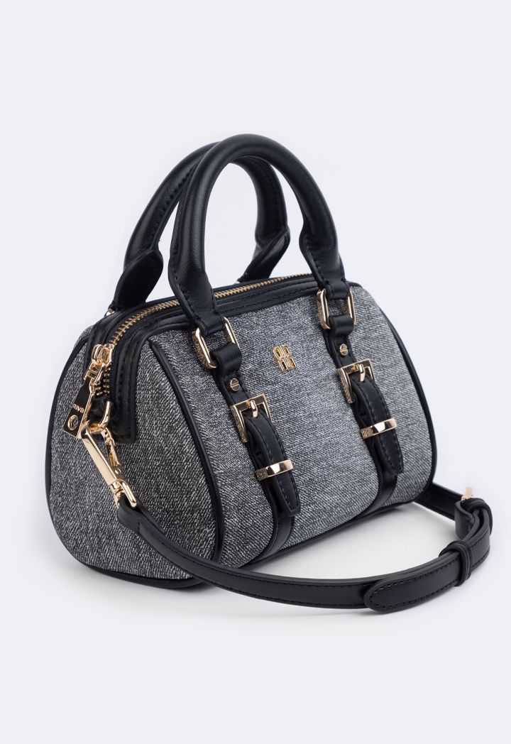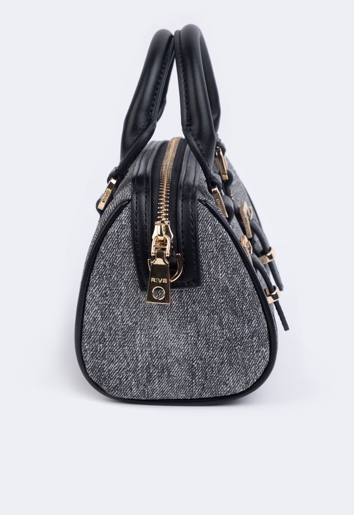 A modern denim handbag that features an alluring design and a zipper for closure.