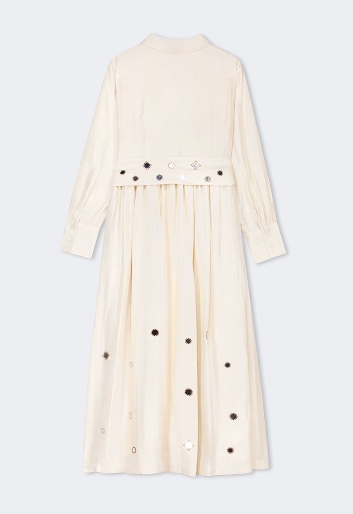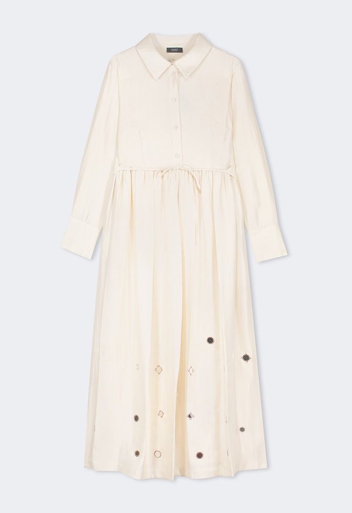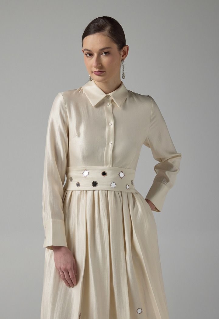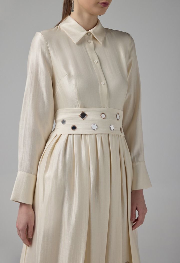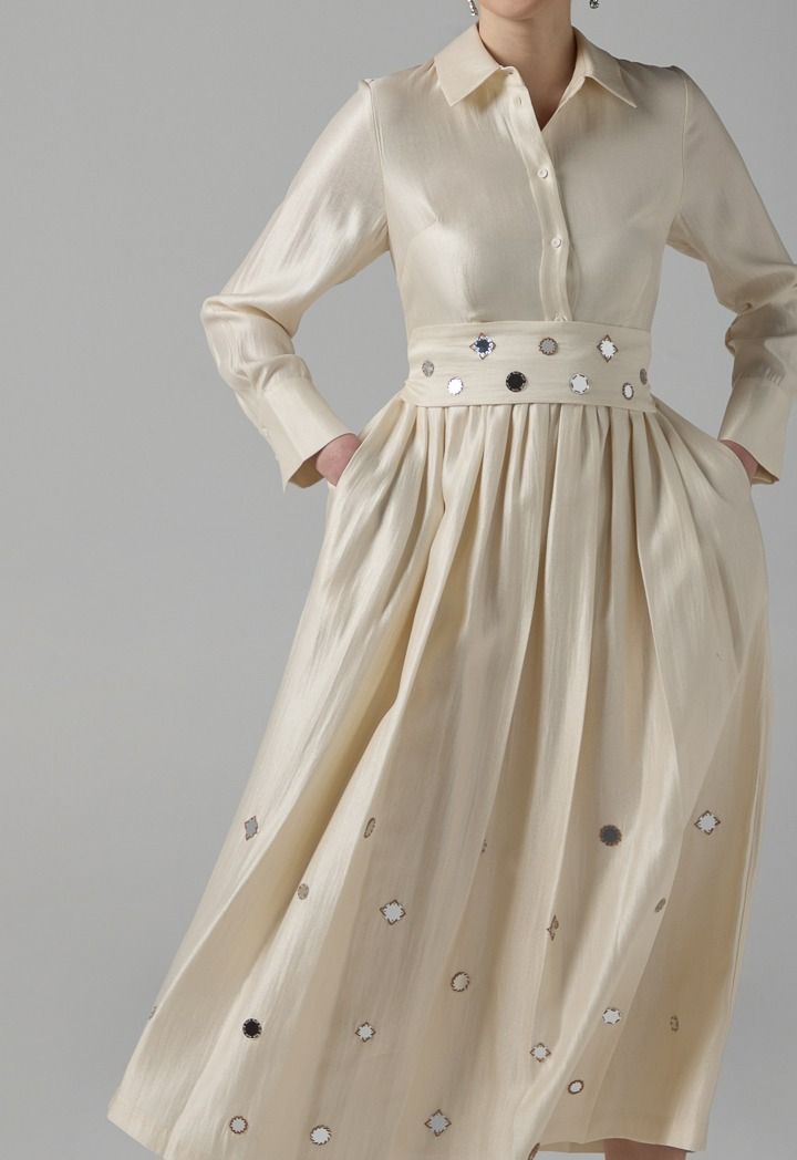 Design: Solid, Flared, Mirror Embroidered, Attached Lining, Elastic Waistband, Belt