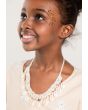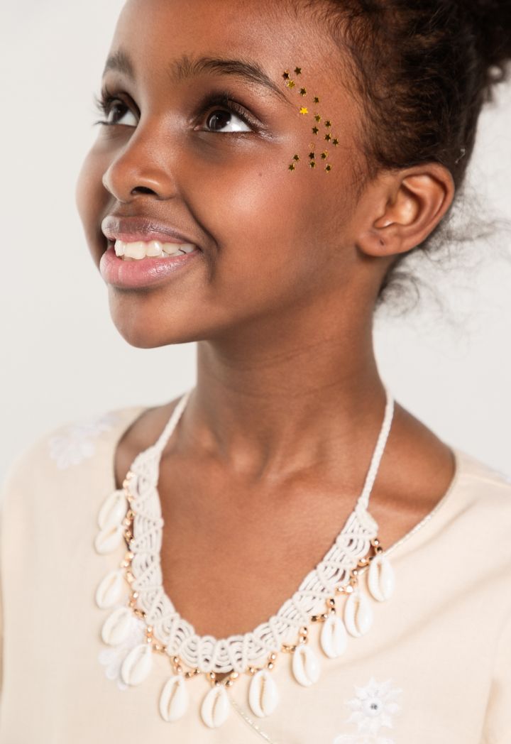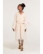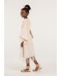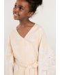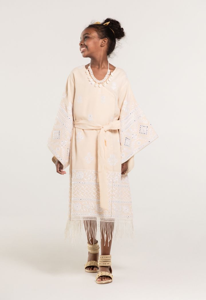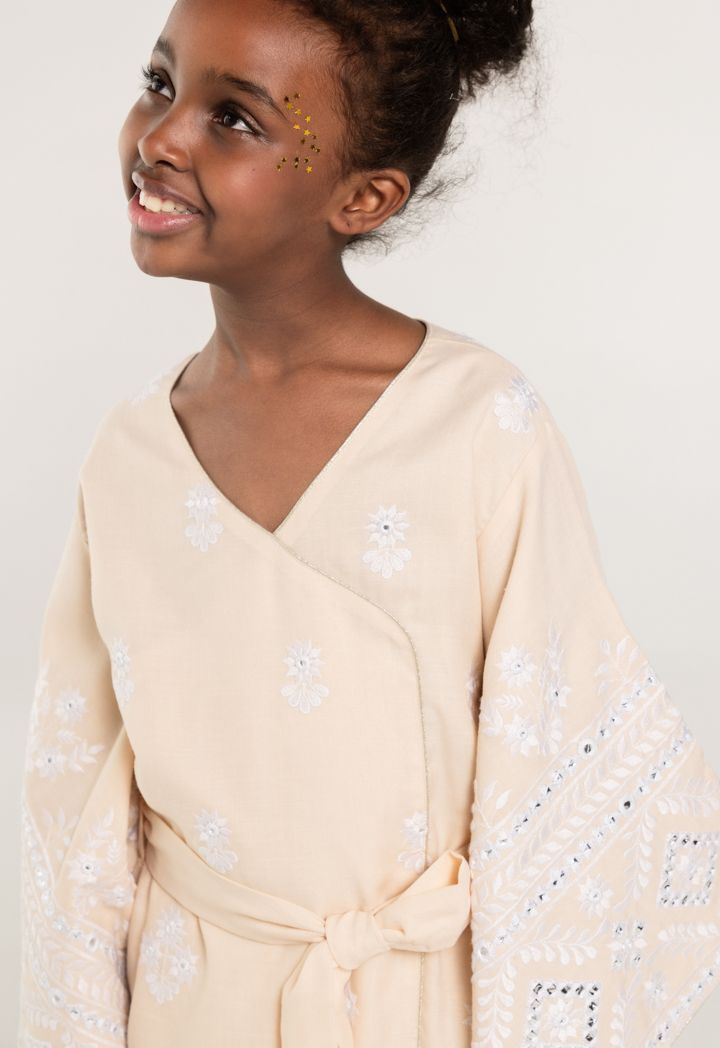 Dress with Embroidered Mirror Floral Details. It features a V-neckline and Wide Kimono Sleeves.