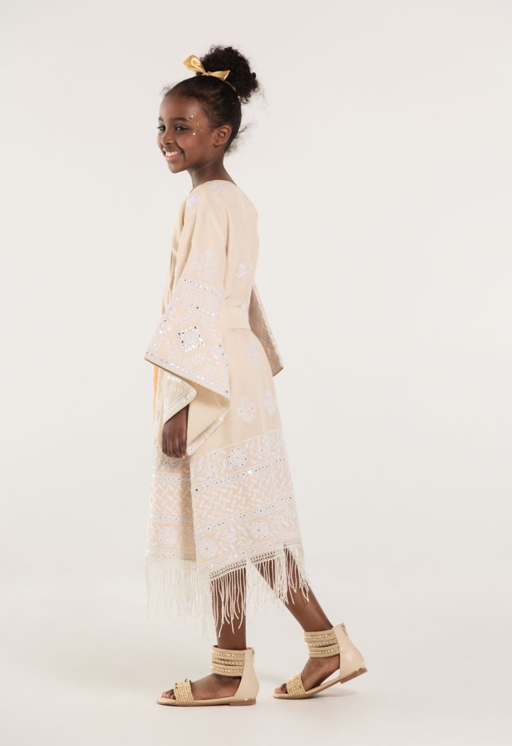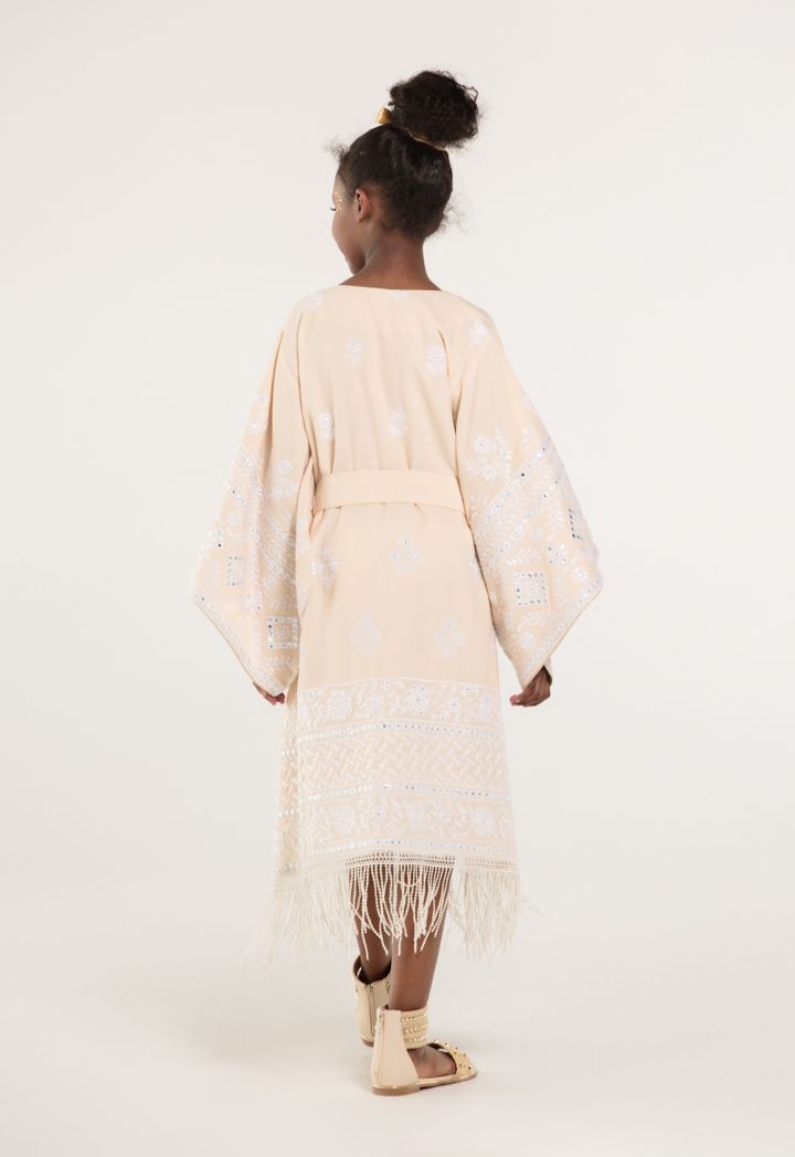 Design: Mirror Floral Embroidered, Belted, Attached Lining, Fringe Hem